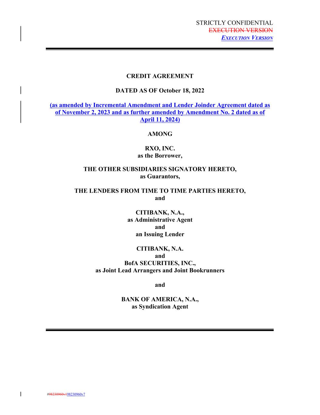 STRICTLY CONFIDENTIAL EXECUTION VERSION EXECUTION VERSION CREDIT AGREEMENT DATED AS OF October 18, 2022 (as amended by Incremental Amendment and Lender Joinder Agreement dated as of November 2, 2023 and as further amended by Amendment No. 2 dated as of April 11, 2024) AMONG RXO, INC. as the Borrower, THE OTHER SUBSIDIARIES SIGNATORY HERETO, as Guarantors, THE LENDERS FROM TIME TO TIME PARTIES HERETO, and CITIBANK, N.A., as Administrative Agent and an Issuing Lender CITIBANK, N.A. and BofA SECURITIES, INC., as Joint Lead Arrangers and Joint Bookrunners and BANK OF AMERICA, N.A., as Syndication Agent #98230960v198230960v7