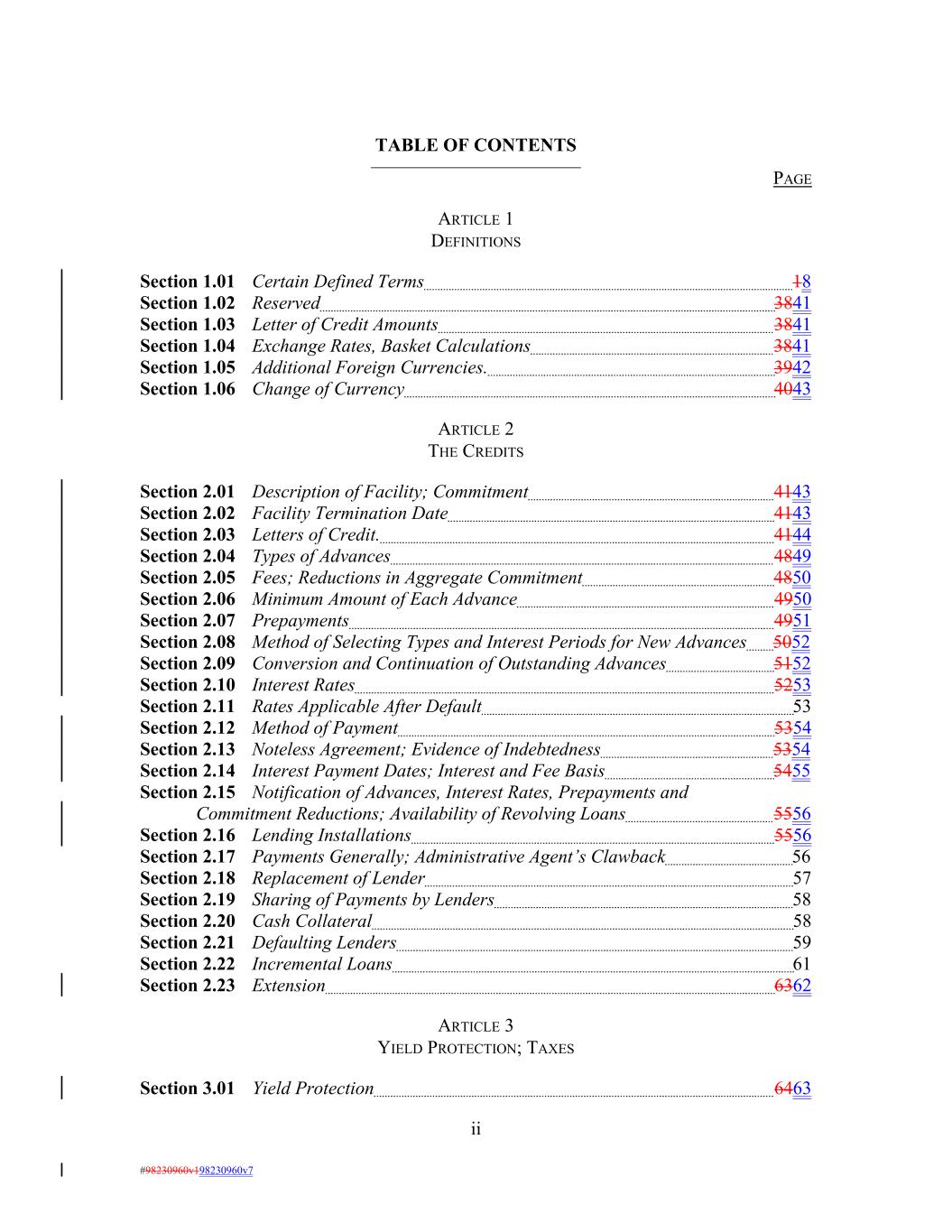 TABLE OF CONTENTS PAGE ARTICLE 1 DEFINITIONS Section 1.01 Certain Defined Terms 18 Section 1.02 Reserved 3841 Section 1.03 Letter of Credit Amounts 3841 Section 1.04 Exchange Rates, Basket Calculations 3841 Section 1.05 Additional Foreign Currencies. 3942 Section 1.06 Change of Currency 4043 ARTICLE 2 THE CREDITS Section 2.01 Description of Facility; Commitment 4143 Section 2.02 Facility Termination Date 4143 Section 2.03 Letters of Credit. 4144 Section 2.04 Types of Advances 4849 Section 2.05 Fees; Reductions in Aggregate Commitment 4850 Section 2.06 Minimum Amount of Each Advance 4950 Section 2.07 Prepayments 4951 Section 2.08 Method of Selecting Types and Interest Periods for New Advances 5052 Section 2.09 Conversion and Continuation of Outstanding Advances 5152 Section 2.10 Interest Rates 5253 Section 2.11 Rates Applicable After Default 53 Section 2.12 Method of Payment 5354 Section 2.13 Noteless Agreement; Evidence of Indebtedness 5354 Section 2.14 Interest Payment Dates; Interest and Fee Basis 5455 Section 2.15 Notification of Advances, Interest Rates, Prepayments and Commitment Reductions; Availability of Revolving Loans 5556 Section 2.16 Lending Installations 5556 Section 2.17 Payments Generally; Administrative Agent’s Clawback 56 Section 2.18 Replacement of Lender 57 Section 2.19 Sharing of Payments by Lenders 58 Section 2.20 Cash Collateral 58 Section 2.21 Defaulting Lenders 59 Section 2.22 Incremental Loans 61 Section 2.23 Extension 6362 ARTICLE 3 YIELD PROTECTION; TAXES Section 3.01 Yield Protection 6463 ii #98230960v198230960v7
