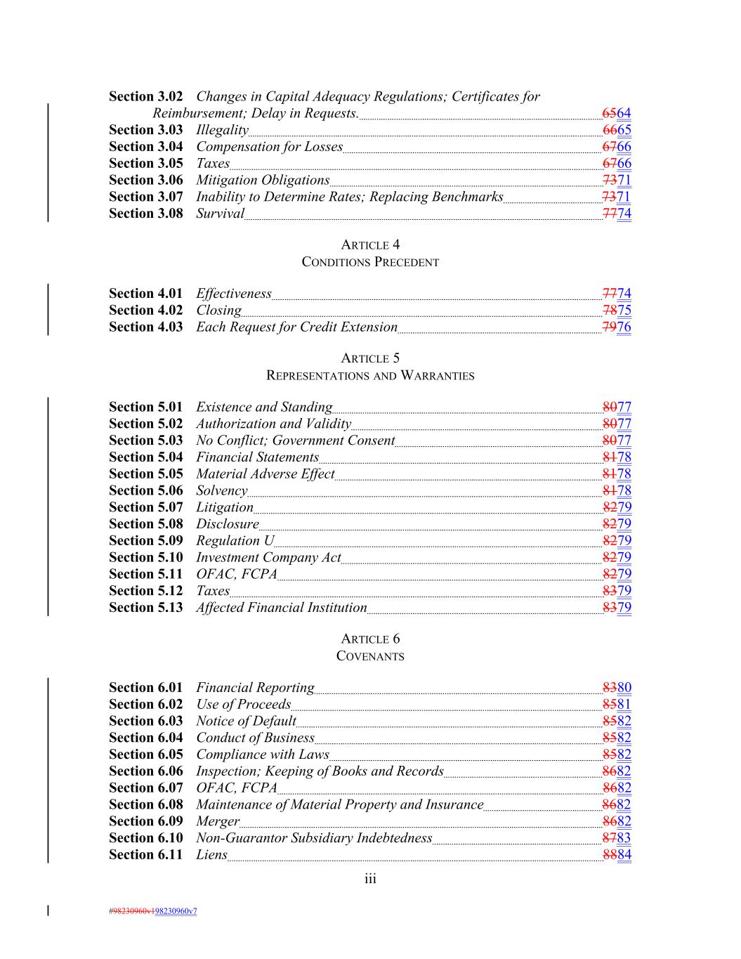 Section 3.02 Changes in Capital Adequacy Regulations; Certificates for Reimbursement; Delay in Requests. 6564 Section 3.03 Illegality 6665 Section 3.04 Compensation for Losses 6766 Section 3.05 Taxes 6766 Section 3.06 Mitigation Obligations 7371 Section 3.07 Inability to Determine Rates; Replacing Benchmarks 7371 Section 3.08 Survival 7774 ARTICLE 4 CONDITIONS PRECEDENT Section 4.01 Effectiveness 7774 Section 4.02 Closing 7875 Section 4.03 Each Request for Credit Extension 7976 ARTICLE 5 REPRESENTATIONS AND WARRANTIES Section 5.01 Existence and Standing 8077 Section 5.02 Authorization and Validity 8077 Section 5.03 No Conflict; Government Consent 8077 Section 5.04 Financial Statements 8178 Section 5.05 Material Adverse Effect 8178 Section 5.06 Solvency 8178 Section 5.07 Litigation 8279 Section 5.08 Disclosure 8279 Section 5.09 Regulation U 8279 Section 5.10 Investment Company Act 8279 Section 5.11 OFAC, FCPA 8279 Section 5.12 Taxes 8379 Section 5.13 Affected Financial Institution 8379 ARTICLE 6 COVENANTS Section 6.01 Financial Reporting 8380 Section 6.02 Use of Proceeds 8581 Section 6.03 Notice of Default 8582 Section 6.04 Conduct of Business 8582 Section 6.05 Compliance with Laws 8582 Section 6.06 Inspection; Keeping of Books and Records 8682 Section 6.07 OFAC, FCPA 8682 Section 6.08 Maintenance of Material Property and Insurance 8682 Section 6.09 Merger 8682 Section 6.10 Non-Guarantor Subsidiary Indebtedness 8783 Section 6.11 Liens 8884 iii #98230960v198230960v7