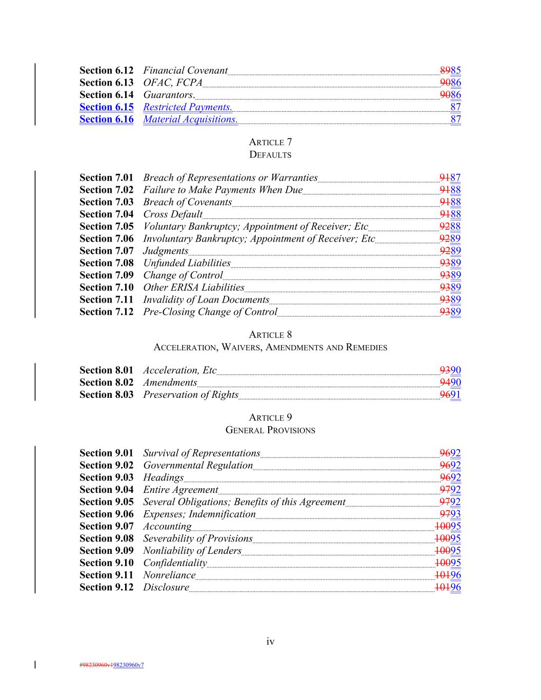 Section 6.12 Financial Covenant 8985 Section 6.13 OFAC, FCPA 9086 Section 6.14 Guarantors. 9086 Section 6.15 Restricted Payments. 87 Section 6.16 Material Acquisitions. 87 ARTICLE 7 DEFAULTS Section 7.01 Breach of Representations or Warranties 9187 Section 7.02 Failure to Make Payments When Due 9188 Section 7.03 Breach of Covenants 9188 Section 7.04 Cross Default 9188 Section 7.05 Voluntary Bankruptcy; Appointment of Receiver; Etc 9288 Section 7.06 Involuntary Bankruptcy; Appointment of Receiver; Etc 9289 Section 7.07 Judgments 9289 Section 7.08 Unfunded Liabilities 9389 Section 7.09 Change of Control 9389 Section 7.10 Other ERISA Liabilities 9389 Section 7.11 Invalidity of Loan Documents 9389 Section 7.12 Pre-Closing Change of Control 9389 ARTICLE 8 ACCELERATION, WAIVERS, AMENDMENTS AND REMEDIES Section 8.01 Acceleration, Etc 9390 Section 8.02 Amendments 9490 Section 8.03 Preservation of Rights 9691 ARTICLE 9 GENERAL PROVISIONS Section 9.01 Survival of Representations 9692 Section 9.02 Governmental Regulation 9692 Section 9.03 Headings 9692 Section 9.04 Entire Agreement 9792 Section 9.05 Several Obligations; Benefits of this Agreement 9792 Section 9.06 Expenses; Indemnification 9793 Section 9.07 Accounting 10095 Section 9.08 Severability of Provisions 10095 Section 9.09 Nonliability of Lenders 10095 Section 9.10 Confidentiality 10095 Section 9.11 Nonreliance 10196 Section 9.12 Disclosure 10196 iv #98230960v198230960v7
