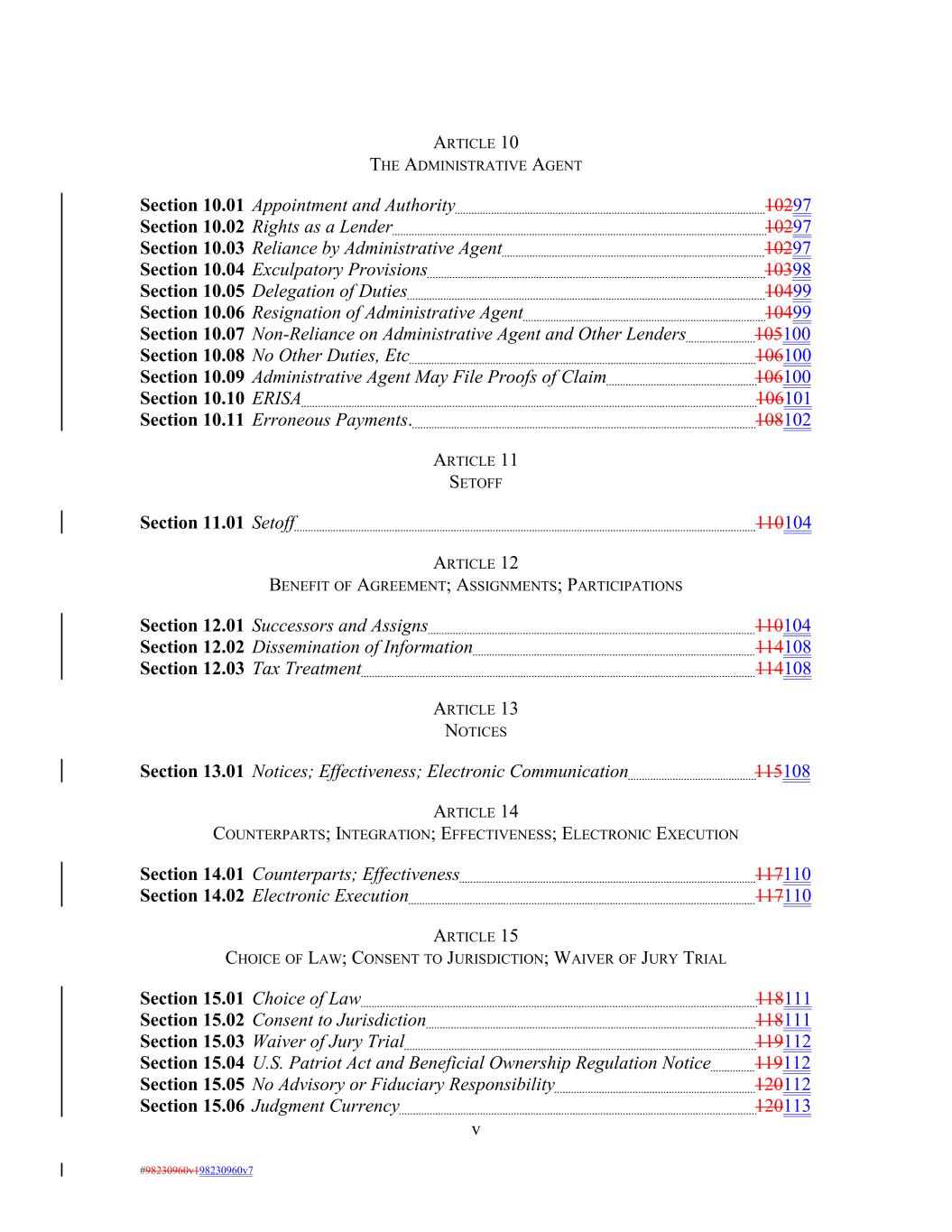 ARTICLE 10 THE ADMINISTRATIVE AGENT Section 10.01 Appointment and Authority 10297 Section 10.02 Rights as a Lender 10297 Section 10.03 Reliance by Administrative Agent 10297 Section 10.04 Exculpatory Provisions 10398 Section 10.05 Delegation of Duties 10499 Section 10.06 Resignation of Administrative Agent 10499 Section 10.07 Non-Reliance on Administrative Agent and Other Lenders 105100 Section 10.08 No Other Duties, Etc 106100 Section 10.09 Administrative Agent May File Proofs of Claim 106100 Section 10.10 ERISA 106101 Section 10.11 Erroneous Payments. 108102 ARTICLE 11 SETOFF Section 11.01 Setoff 110104 ARTICLE 12 BENEFIT OF AGREEMENT; ASSIGNMENTS; PARTICIPATIONS Section 12.01 Successors and Assigns 110104 Section 12.02 Dissemination of Information 114108 Section 12.03 Tax Treatment 114108 ARTICLE 13 NOTICES Section 13.01 Notices; Effectiveness; Electronic Communication 115108 ARTICLE 14 COUNTERPARTS; INTEGRATION; EFFECTIVENESS; ELECTRONIC EXECUTION Section 14.01 Counterparts; Effectiveness 117110 Section 14.02 Electronic Execution 117110 ARTICLE 15 CHOICE OF LAW; CONSENT TO JURISDICTION; WAIVER OF JURY TRIAL Section 15.01 Choice of Law 118111 Section 15.02 Consent to Jurisdiction 118111 Section 15.03 Waiver of Jury Trial 119112 Section 15.04 U.S. Patriot Act and Beneficial Ownership Regulation Notice 119112 Section 15.05 No Advisory or Fiduciary Responsibility 120112 Section 15.06 Judgment Currency 120113 v #98230960v198230960v7