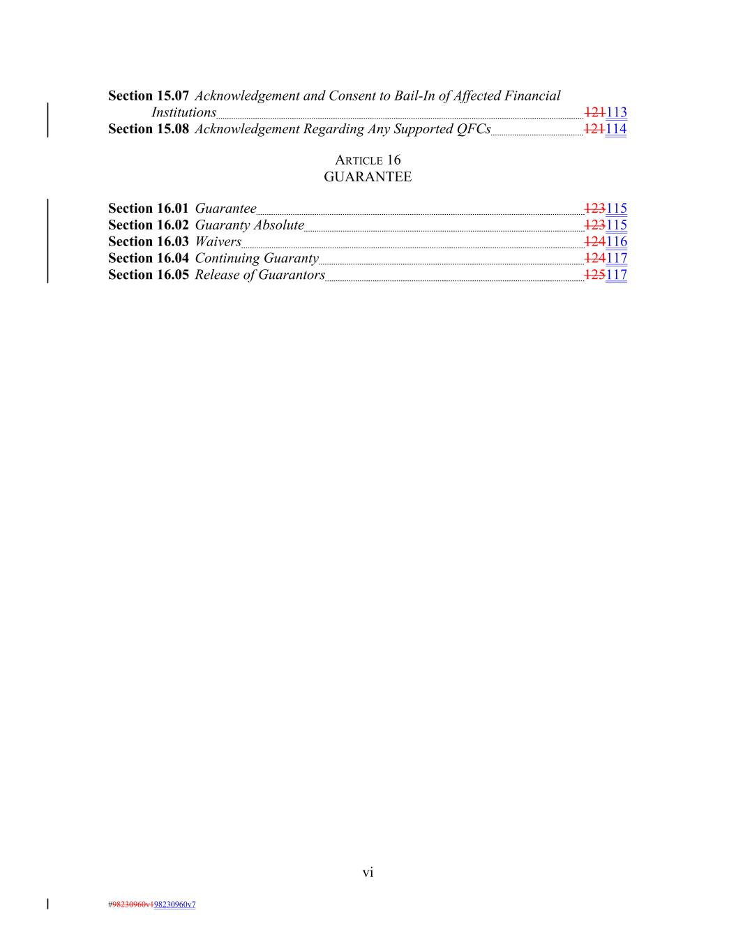 Section 15.07 Acknowledgement and Consent to Bail-In of Affected Financial Institutions 121113 Section 15.08 Acknowledgement Regarding Any Supported QFCs 121114 ARTICLE 16 GUARANTEE Section 16.01 Guarantee 123115 Section 16.02 Guaranty Absolute 123115 Section 16.03 Waivers 124116 Section 16.04 Continuing Guaranty 124117 Section 16.05 Release of Guarantors 125117 vi #98230960v198230960v7