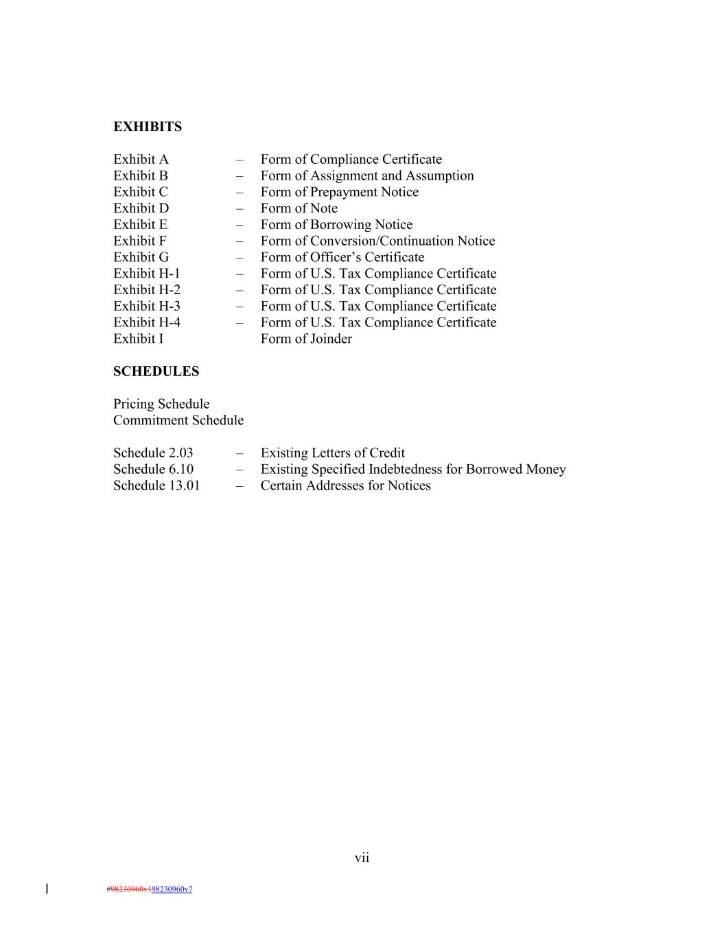 vii #98230960v198230960v7 Form of U.S. Tax Compliance Certificate Exhibit H-3 Exhibit D – Exhibit A Form of U.S. Tax Compliance Certificate – Exhibit H-4 Form of Note – – Form of U.S. Tax Compliance Certificate Exhibit I Exhibit E Form of Compliance Certificate Form of Joinder – Form of Borrowing Notice SCHEDULES Exhibit F Exhibit B – Form of Conversion/Continuation Notice – EXHIBITS Pricing Schedule Exhibit G Form of Assignment and Assumption Commitment Schedule – Form of Officer’s Certificate Schedule 2.03 Exhibit H-1 – Exhibit C Existing Letters of Credit – Schedule 6.10 Form of U.S. Tax Compliance Certificate – – Existing Specified Indebtedness for Borrowed Money Schedule 13.01 Exhibit H-2 – Form of Prepayment Notice Certain Addresses for Notices –