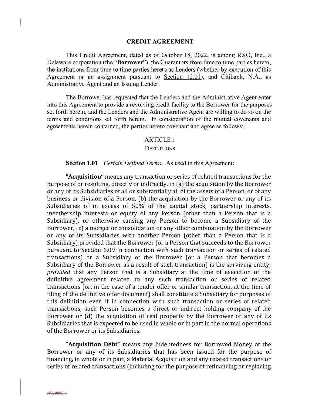 CREDIT AGREEMENT This Credit Agreement, dated as of October 18, 2022, is among RXO, Inc., a Delaware corporation (the “Borrower”), the Guarantors from time to time parties hereto, the institutions from time to time parties hereto as Lenders (whether by execution of this Agreement or an assignment pursuant to Section 12.01), and Citibank, N.A., as Administrative Agent and an Issuing Lender. The Borrower has requested that the Lenders and the Administrative Agent enter into this Agreement to provide a revolving credit facility to the Borrower for the purposes set forth herein, and the Lenders and the Administrative Agent are willing to do so on the terms and conditions set forth herein. In consideration of the mutual covenants and agreements herein contained, the parties hereto covenant and agree as follows: ARTICLE 1 DEFINITIONS Section 1.01 Certain Defined Terms. As used in this Agreement: “Acquisition” means any transaction or series of related transactions for the purpose of or resulting, directly or indirectly, in (a) the acquisition by the Borrower or any of its Subsidiaries of all or substantially all of the assets of a Person, or of any business or division of a Person, (b) the acquisition by the Borrower or any of its Subsidiaries of in excess of 50% of the capital stock, partnership interests, membership interests or equity of any Person (other than a Person that is a Subsidiary), or otherwise causing any Person to become a Subsidiary of the Borrower, (c) a merger or consolidation or any other combination by the Borrower or any of its Subsidiaries with another Person (other than a Person that is a Subsidiary) provided that the Borrower (or a Person that succeeds to the Borrower pursuant to Section 6.09 in connection with such transaction or series of related transactions) or a Subsidiary of the Borrower (or a Person that becomes a Subsidiary of the Borrower as a result of such transaction) is the surviving entity; provided that any Person that is a Subsidiary at the time of execution of the definitive agreement related to any such transaction or series of related transactions (or, in the case of a tender offer or similar transaction, at the time of filing of the definitive offer document) shall constitute a Subsidiary for purposes of this definition even if in connection with such transaction or series of related transactions, such Person becomes a direct or indirect holding company of the Borrower or (d) the acquisition of real property by the Borrower or any of its Subsidiaries that is expected to be used in whole or in part in the normal operations of the Borrower or its Subsidiaries. “Acquisition Debt” means any Indebtedness for Borrowed Money of the Borrower or any of its Subsidiaries that has been issued for the purpose of financing, in whole or in part, a Material Acquisition and any related transactions or series of related transactions (including for the purpose of refinancing or replacing #98230960v1