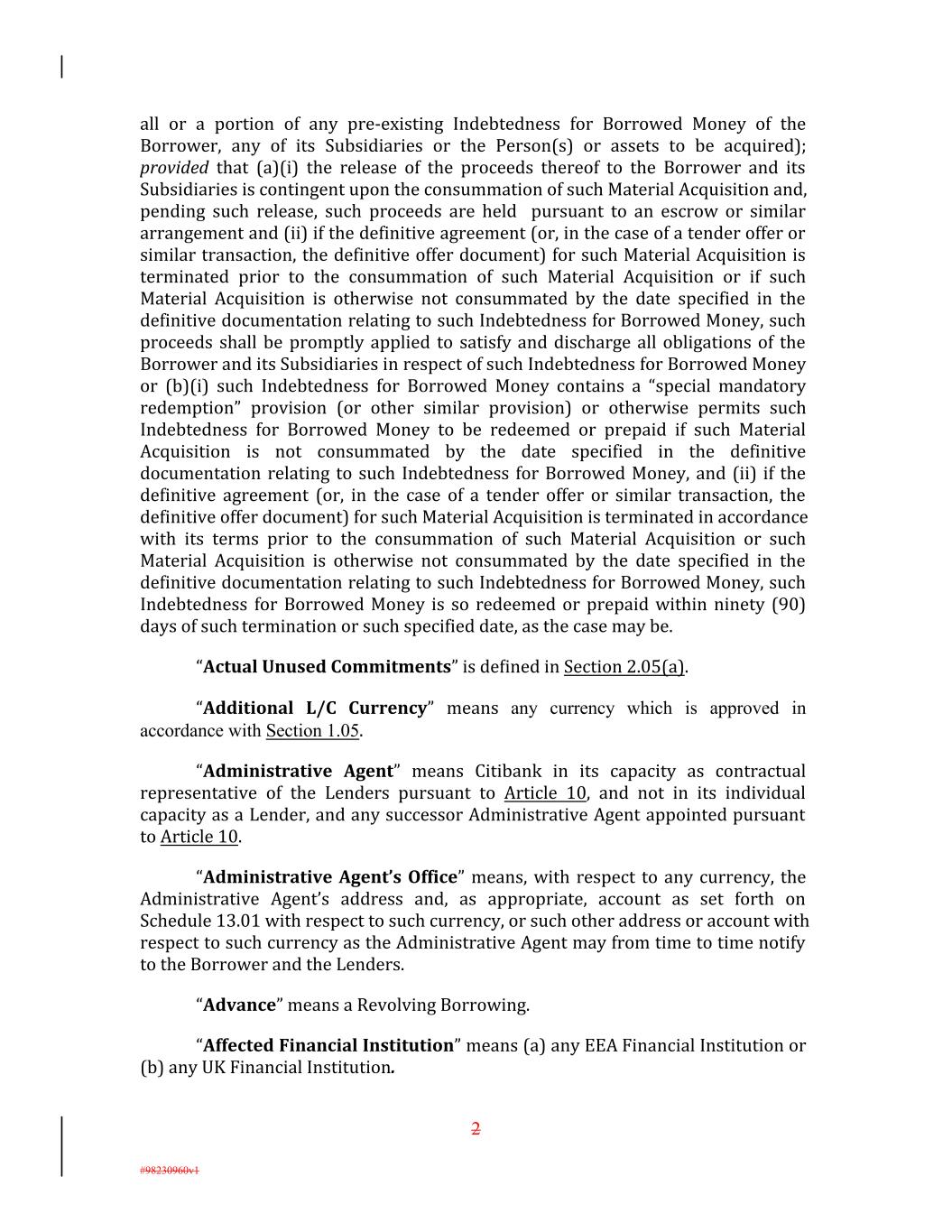 all or a portion of any pre-existing Indebtedness for Borrowed Money of the Borrower, any of its Subsidiaries or the Person(s) or assets to be acquired); provided that (a)(i) the release of the proceeds thereof to the Borrower and its Subsidiaries is contingent upon the consummation of such Material Acquisition and, pending such release, such proceeds are held pursuant to an escrow or similar arrangement and (ii) if the definitive agreement (or, in the case of a tender offer or similar transaction, the definitive offer document) for such Material Acquisition is terminated prior to the consummation of such Material Acquisition or if such Material Acquisition is otherwise not consummated by the date specified in the definitive documentation relating to such Indebtedness for Borrowed Money, such proceeds shall be promptly applied to satisfy and discharge all obligations of the Borrower and its Subsidiaries in respect of such Indebtedness for Borrowed Money or (b)(i) such Indebtedness for Borrowed Money contains a “special mandatory redemption” provision (or other similar provision) or otherwise permits such Indebtedness for Borrowed Money to be redeemed or prepaid if such Material Acquisition is not consummated by the date specified in the definitive documentation relating to such Indebtedness for Borrowed Money, and (ii) if the definitive agreement (or, in the case of a tender offer or similar transaction, the definitive offer document) for such Material Acquisition is terminated in accordance with its terms prior to the consummation of such Material Acquisition or such Material Acquisition is otherwise not consummated by the date specified in the definitive documentation relating to such Indebtedness for Borrowed Money, such Indebtedness for Borrowed Money is so redeemed or prepaid within ninety (90) days of such termination or such specified date, as the case may be. “Actual Unused Commitments” is de�ined in Section 2.05(a). “Additional L/C Currency” means any currency which is approved in accordance with Section 1.05. “Administrative Agent” means Citibank in its capacity as contractual representative of the Lenders pursuant to Article 10, and not in its individual capacity as a Lender, and any successor Administrative Agent appointed pursuant to Article 10. “Administrative Agent’s Office” means, with respect to any currency, the Administrative Agent’s address and, as appropriate, account as set forth on Schedule 13.01 with respect to such currency, or such other address or account with respect to such currency as the Administrative Agent may from time to time notify to the Borrower and the Lenders. “Advance” means a Revolving Borrowing. “Affected Financial Institution” means (a) any EEA Financial Institution or (b) any UK Financial Institution. 2 #98230960v1