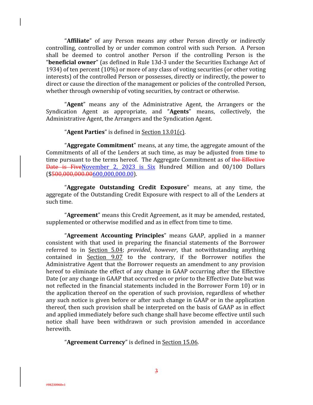 “Affiliate” of any Person means any other Person directly or indirectly controlling, controlled by or under common control with such Person. A Person shall be deemed to control another Person if the controlling Person is the “beneficial owner” (as defined in Rule 13d-3 under the Securities Exchange Act of 1934) of ten percent (10%) or more of any class of voting securities (or other voting interests) of the controlled Person or possesses, directly or indirectly, the power to direct or cause the direction of the management or policies of the controlled Person, whether through ownership of voting securities, by contract or otherwise. “Agent” means any of the Administrative Agent, the Arrangers or the Syndication Agent as appropriate, and “Agents” means, collectively, the Administrative Agent, the Arrangers and the Syndication Agent. “Agent Parties” is de�ined in Section 13.01(c). “Aggregate Commitment” means, at any time, the aggregate amount of the Commitments of all of the Lenders at such time, as may be adjusted from time to time pursuant to the terms hereof. The Aggregate Commitment as of the Effective Date is FiveNovember 2, 2023 is Six Hundred Million and 00/100 Dollars ($500,000,000.00600,000,000.00). “Aggregate Outstanding Credit Exposure” means, at any time, the aggregate of the Outstanding Credit Exposure with respect to all of the Lenders at such time. “Agreement” means this Credit Agreement, as it may be amended, restated, supplemented or otherwise modified and as in effect from time to time. “Agreement Accounting Principles” means GAAP, applied in a manner consistent with that used in preparing the financial statements of the Borrower referred to in Section 5.04; provided, however, that notwithstanding anything contained in Section 9.07 to the contrary, if the Borrower notifies the Administrative Agent that the Borrower requests an amendment to any provision hereof to eliminate the effect of any change in GAAP occurring after the Effective Date (or any change in GAAP that occurred on or prior to the Effective Date but was not reflected in the financial statements included in the Borrower Form 10) or in the application thereof on the operation of such provision, regardless of whether any such notice is given before or after such change in GAAP or in the application thereof, then such provision shall be interpreted on the basis of GAAP as in effect and applied immediately before such change shall have become effective until such notice shall have been withdrawn or such provision amended in accordance herewith. “Agreement Currency” is defined in Section 15.06. 3 #98230960v1