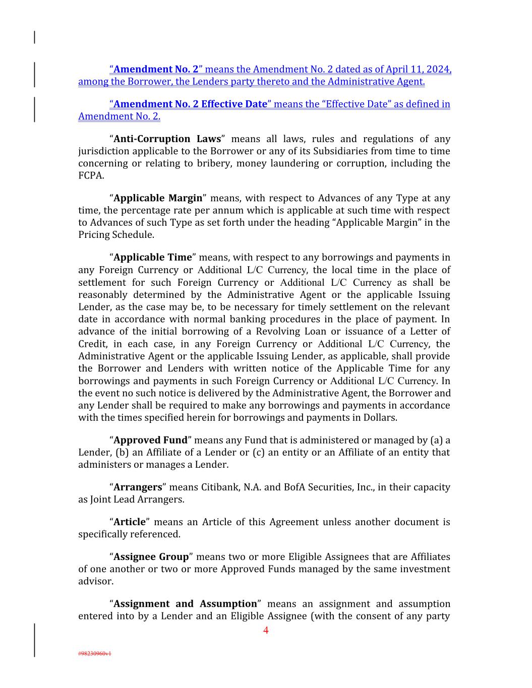 “Amendment No. 2” means the Amendment No. 2 dated as of April 11, 2024, among the Borrower, the Lenders party thereto and the Administrative Agent. “Amendment No. 2 Effective Date” means the “Effective Date” as defined in Amendment No. 2. “Anti-Corruption Laws” means all laws, rules and regulations of any jurisdiction applicable to the Borrower or any of its Subsidiaries from time to time concerning or relating to bribery, money laundering or corruption, including the FCPA. “Applicable Margin” means, with respect to Advances of any Type at any time, the percentage rate per annum which is applicable at such time with respect to Advances of such Type as set forth under the heading “Applicable Margin” in the Pricing Schedule. “Applicable Time” means, with respect to any borrowings and payments in any Foreign Currency or Additional L/C Currency, the local time in the place of settlement for such Foreign Currency or Additional L/C Currency as shall be reasonably determined by the Administrative Agent or the applicable Issuing Lender, as the case may be, to be necessary for timely settlement on the relevant date in accordance with normal banking procedures in the place of payment. In advance of the initial borrowing of a Revolving Loan or issuance of a Letter of Credit, in each case, in any Foreign Currency or Additional L/C Currency, the Administrative Agent or the applicable Issuing Lender, as applicable, shall provide the Borrower and Lenders with written notice of the Applicable Time for any borrowings and payments in such Foreign Currency or Additional L/C Currency. In the event no such notice is delivered by the Administrative Agent, the Borrower and any Lender shall be required to make any borrowings and payments in accordance with the times specified herein for borrowings and payments in Dollars. “Approved Fund” means any Fund that is administered or managed by (a) a Lender, (b) an Affiliate of a Lender or (c) an entity or an Affiliate of an entity that administers or manages a Lender. “Arrangers” means Citibank, N.A. and BofA Securities, Inc., in their capacity as Joint Lead Arrangers. “Article” means an Article of this Agreement unless another document is specifically referenced. “Assignee Group” means two or more Eligible Assignees that are Affiliates of one another or two or more Approved Funds managed by the same investment advisor. “Assignment and Assumption” means an assignment and assumption entered into by a Lender and an Eligible Assignee (with the consent of any party 4 #98230960v1