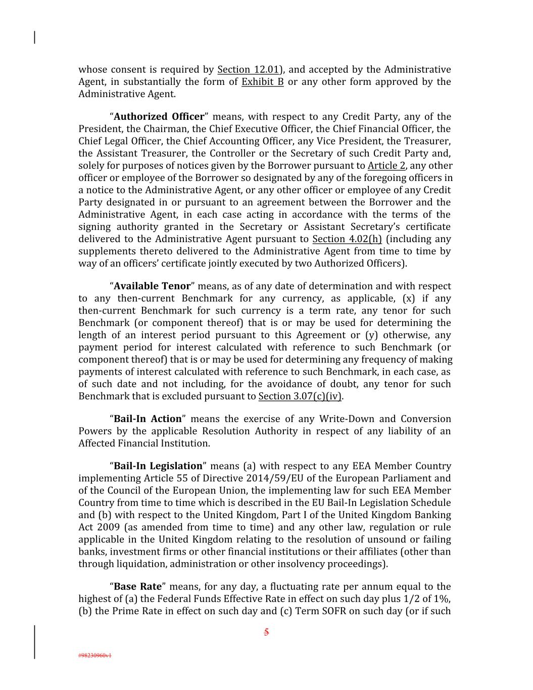 whose consent is required by Section 12.01), and accepted by the Administrative Agent, in substantially the form of Exhibit B or any other form approved by the Administrative Agent. “Authorized Officer” means, with respect to any Credit Party, any of the President, the Chairman, the Chief Executive Officer, the Chief Financial Officer, the Chief Legal Officer, the Chief Accounting Officer, any Vice President, the Treasurer, the Assistant Treasurer, the Controller or the Secretary of such Credit Party and, solely for purposes of notices given by the Borrower pursuant to Article 2, any other officer or employee of the Borrower so designated by any of the foregoing officers in a notice to the Administrative Agent, or any other officer or employee of any Credit Party designated in or pursuant to an agreement between the Borrower and the Administrative Agent, in each case acting in accordance with the terms of the signing authority granted in the Secretary or Assistant Secretary’s certificate delivered to the Administrative Agent pursuant to Section 4.02(h) (including any supplements thereto delivered to the Administrative Agent from time to time by way of an officers’ certificate jointly executed by two Authorized Officers). “Available Tenor” means, as of any date of determination and with respect to any then-current Benchmark for any currency, as applicable, (x) if any then-current Benchmark for such currency is a term rate, any tenor for such Benchmark (or component thereof) that is or may be used for determining the length of an interest period pursuant to this Agreement or (y) otherwise, any payment period for interest calculated with reference to such Benchmark (or component thereof) that is or may be used for determining any frequency of making payments of interest calculated with reference to such Benchmark, in each case, as of such date and not including, for the avoidance of doubt, any tenor for such Benchmark that is excluded pursuant to Section 3.07(c)(iv). “Bail-In Action” means the exercise of any Write-Down and Conversion Powers by the applicable Resolution Authority in respect of any liability of an Affected Financial Institution. “Bail-In Legislation” means (a) with respect to any EEA Member Country implementing Article 55 of Directive 2014/59/EU of the European Parliament and of the Council of the European Union, the implementing law for such EEA Member Country from time to time which is described in the EU Bail-In Legislation Schedule and (b) with respect to the United Kingdom, Part I of the United Kingdom Banking Act 2009 (as amended from time to time) and any other law, regulation or rule applicable in the United Kingdom relating to the resolution of unsound or failing banks, investment firms or other financial institutions or their affiliates (other than through liquidation, administration or other insolvency proceedings). “Base Rate” means, for any day, a fluctuating rate per annum equal to the highest of (a) the Federal Funds Effective Rate in effect on such day plus 1/2 of 1%, (b) the Prime Rate in effect on such day and (c) Term SOFR on such day (or if such 5 #98230960v1