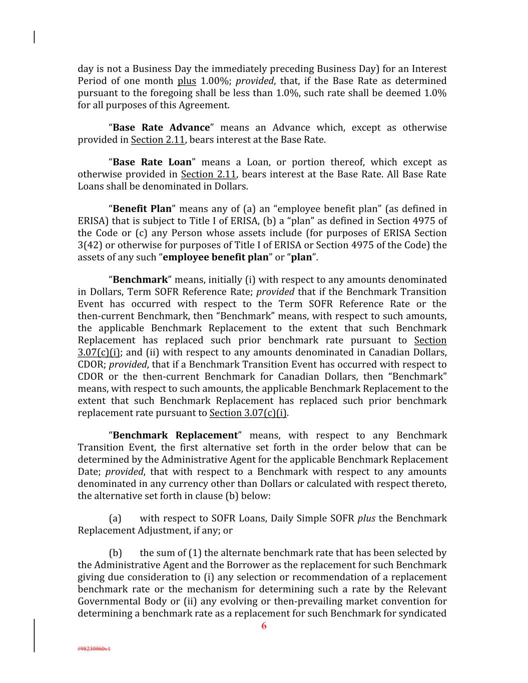 day is not a Business Day the immediately preceding Business Day) for an Interest Period of one month plus 1.00%; provided, that, if the Base Rate as determined pursuant to the foregoing shall be less than 1.0%, such rate shall be deemed 1.0% for all purposes of this Agreement. “Base Rate Advance” means an Advance which, except as otherwise provided in Section 2.11, bears interest at the Base Rate. “Base Rate Loan” means a Loan, or portion thereof, which except as otherwise provided in Section 2.11, bears interest at the Base Rate. All Base Rate Loans shall be denominated in Dollars. “Benefit Plan” means any of (a) an “employee benefit plan” (as defined in ERISA) that is subject to Title I of ERISA, (b) a “plan” as defined in Section 4975 of the Code or (c) any Person whose assets include (for purposes of ERISA Section 3(42) or otherwise for purposes of Title I of ERISA or Section 4975 of the Code) the assets of any such “employee benefit plan” or “plan”. “Benchmark” means, initially (i) with respect to any amounts denominated in Dollars, Term SOFR Reference Rate; provided that if the Benchmark Transition Event has occurred with respect to the Term SOFR Reference Rate or the then-current Benchmark, then “Benchmark” means, with respect to such amounts, the applicable Benchmark Replacement to the extent that such Benchmark Replacement has replaced such prior benchmark rate pursuant to Section 3.07(c)(i); and (ii) with respect to any amounts denominated in Canadian Dollars, CDOR; provided, that if a Benchmark Transition Event has occurred with respect to CDOR or the then-current Benchmark for Canadian Dollars, then “Benchmark” means, with respect to such amounts, the applicable Benchmark Replacement to the extent that such Benchmark Replacement has replaced such prior benchmark replacement rate pursuant to Section 3.07(c)(i). “Benchmark Replacement” means, with respect to any Benchmark Transition Event, the first alternative set forth in the order below that can be determined by the Administrative Agent for the applicable Benchmark Replacement Date; provided, that with respect to a Benchmark with respect to any amounts denominated in any currency other than Dollars or calculated with respect thereto, the alternative set forth in clause (b) below: (a) with respect to SOFR Loans, Daily Simple SOFR plus the Benchmark Replacement Adjustment, if any; or (b) the sum of (1) the alternate benchmark rate that has been selected by the Administrative Agent and the Borrower as the replacement for such Benchmark giving due consideration to (i) any selection or recommendation of a replacement benchmark rate or the mechanism for determining such a rate by the Relevant Governmental Body or (ii) any evolving or then-prevailing market convention for determining a benchmark rate as a replacement for such Benchmark for syndicated 6 #98230960v1