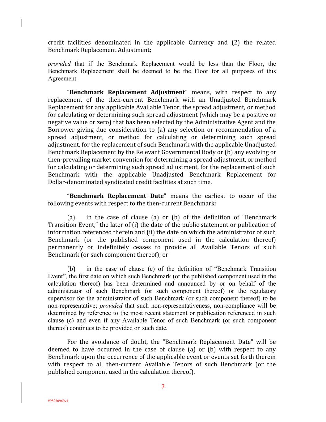 credit facilities denominated in the applicable Currency and (2) the related Benchmark Replacement Adjustment; provided that if the Benchmark Replacement would be less than the Floor, the Benchmark Replacement shall be deemed to be the Floor for all purposes of this Agreement. “Benchmark Replacement Adjustment” means, with respect to any replacement of the then-current Benchmark with an Unadjusted Benchmark Replacement for any applicable Available Tenor, the spread adjustment, or method for calculating or determining such spread adjustment (which may be a positive or negative value or zero) that has been selected by the Administrative Agent and the Borrower giving due consideration to (a) any selection or recommendation of a spread adjustment, or method for calculating or determining such spread adjustment, for the replacement of such Benchmark with the applicable Unadjusted Benchmark Replacement by the Relevant Governmental Body or (b) any evolving or then-prevailing market convention for determining a spread adjustment, or method for calculating or determining such spread adjustment, for the replacement of such Benchmark with the applicable Unadjusted Benchmark Replacement for Dollar-denominated syndicated credit facilities at such time. “Benchmark Replacement Date” means the earliest to occur of the following events with respect to the then-current Benchmark: (a) in the case of clause (a) or (b) of the definition of “Benchmark Transition Event,” the later of (i) the date of the public statement or publication of information referenced therein and (ii) the date on which the administrator of such Benchmark (or the published component used in the calculation thereof) permanently or indefinitely ceases to provide all Available Tenors of such Benchmark (or such component thereof); or (b) in the case of clause (c) of the definition of “Benchmark Transition Event”, the first date on which such Benchmark (or the published component used in the calculation thereof) has been determined and announced by or on behalf of the administrator of such Benchmark (or such component thereof) or the regulatory supervisor for the administrator of such Benchmark (or such component thereof) to be non-representative; provided that such non-representativeness, non-compliance will be determined by reference to the most recent statement or publication referenced in such clause (c) and even if any Available Tenor of such Benchmark (or such component thereof) continues to be provided on such date. For the avoidance of doubt, the “Benchmark Replacement Date” will be deemed to have occurred in the case of clause (a) or (b) with respect to any Benchmark upon the occurrence of the applicable event or events set forth therein with respect to all then-current Available Tenors of such Benchmark (or the published component used in the calculation thereof). 7 #98230960v1