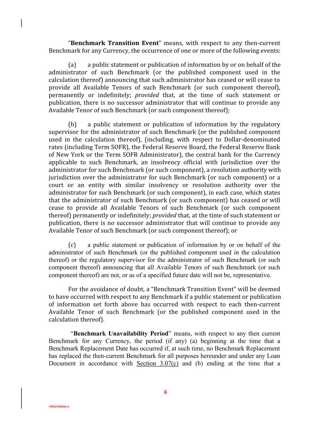 “Benchmark Transition Event” means, with respect to any then-current Benchmark for any Currency, the occurrence of one or more of the following events: (a) a public statement or publication of information by or on behalf of the administrator of such Benchmark (or the published component used in the calculation thereof) announcing that such administrator has ceased or will cease to provide all Available Tenors of such Benchmark (or such component thereof), permanently or indefinitely; provided that, at the time of such statement or publication, there is no successor administrator that will continue to provide any Available Tenor of such Benchmark (or such component thereof); (b) a public statement or publication of information by the regulatory supervisor for the administrator of such Benchmark (or the published component used in the calculation thereof), (including, with respect to Dollar-denominated rates (including Term SOFR), the Federal Reserve Board, the Federal Reserve Bank of New York or the Term SOFR Administrator), the central bank for the Currency applicable to such Benchmark, an insolvency official with jurisdiction over the administrator for such Benchmark (or such component), a resolution authority with jurisdiction over the administrator for such Benchmark (or such component) or a court or an entity with similar insolvency or resolution authority over the administrator for such Benchmark (or such component), in each case, which states that the administrator of such Benchmark (or such component) has ceased or will cease to provide all Available Tenors of such Benchmark (or such component thereof) permanently or indefinitely; provided that, at the time of such statement or publication, there is no successor administrator that will continue to provide any Available Tenor of such Benchmark (or such component thereof); or (c) a public statement or publication of information by or on behalf of the administrator of such Benchmark (or the published component used in the calculation thereof) or the regulatory supervisor for the administrator of such Benchmark (or such component thereof) announcing that all Available Tenors of such Benchmark (or such component thereof) are not, or as of a specified future date will not be, representative. For the avoidance of doubt, a “Benchmark Transition Event” will be deemed to have occurred with respect to any Benchmark if a public statement or publication of information set forth above has occurred with respect to each then-current Available Tenor of such Benchmark (or the published component used in the calculation thereof). “Benchmark Unavailability Period” means, with respect to any then current Benchmark for any Currency, the period (if any) (a) beginning at the time that a Benchmark Replacement Date has occurred if, at such time, no Benchmark Replacement has replaced the then-current Benchmark for all purposes hereunder and under any Loan Document in accordance with Section 3.07(c) and (b) ending at the time that a 8 #98230960v1