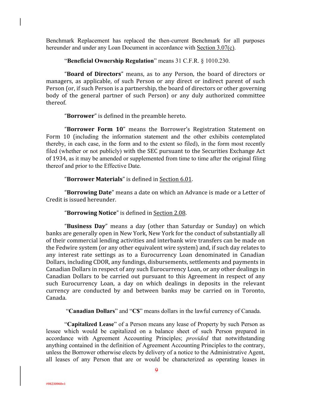 Benchmark Replacement has replaced the then-current Benchmark for all purposes hereunder and under any Loan Document in accordance with Section 3.07(c). “Beneficial Ownership Regulation” means 31 C.F.R. § 1010.230. “Board of Directors” means, as to any Person, the board of directors or managers, as applicable, of such Person or any direct or indirect parent of such Person (or, if such Person is a partnership, the board of directors or other governing body of the general partner of such Person) or any duly authorized committee thereof. “Borrower” is defined in the preamble hereto. “Borrower Form 10” means the Borrower’s Registration Statement on Form 10 (including the information statement and the other exhibits contemplated thereby, in each case, in the form and to the extent so filed), in the form most recently filed (whether or not publicly) with the SEC pursuant to the Securities Exchange Act of 1934, as it may be amended or supplemented from time to time after the original filing thereof and prior to the Effective Date. “Borrower Materials” is de�ined in Section 6.01. “Borrowing Date” means a date on which an Advance is made or a Letter of Credit is issued hereunder. “Borrowing Notice” is de�ined in Section 2.08. “Business Day” means a day (other than Saturday or Sunday) on which banks are generally open in New York, New York for the conduct of substantially all of their commercial lending activities and interbank wire transfers can be made on the Fedwire system (or any other equivalent wire system) and, if such day relates to any interest rate settings as to a Eurocurrency Loan denominated in Canadian Dollars, including CDOR, any fundings, disbursements, settlements and payments in Canadian Dollars in respect of any such Eurocurrency Loan, or any other dealings in Canadian Dollars to be carried out pursuant to this Agreement in respect of any such Eurocurrency Loan, a day on which dealings in deposits in the relevant currency are conducted by and between banks may be carried on in Toronto, Canada. “Canadian Dollars” and “C$” means dollars in the lawful currency of Canada. “Capitalized Lease” of a Person means any lease of Property by such Person as lessee which would be capitalized on a balance sheet of such Person prepared in accordance with Agreement Accounting Principles; provided that notwithstanding anything contained in the definition of Agreement Accounting Principles to the contrary, unless the Borrower otherwise elects by delivery of a notice to the Administrative Agent, all leases of any Person that are or would be characterized as operating leases in 9 #98230960v1