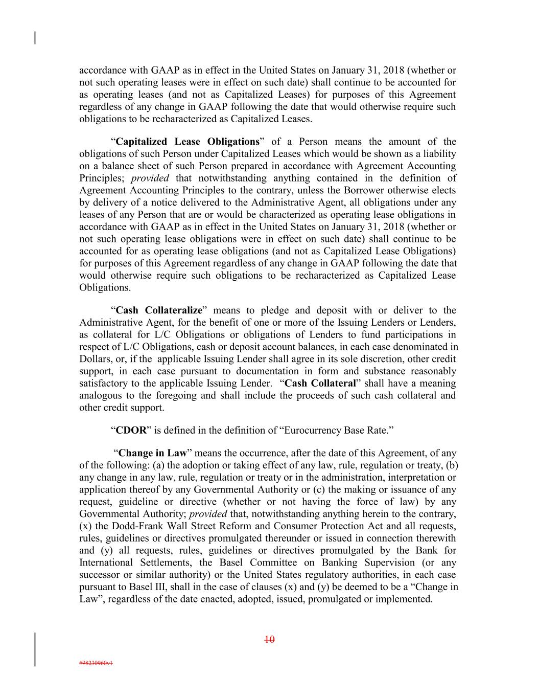 accordance with GAAP as in effect in the United States on January 31, 2018 (whether or not such operating leases were in effect on such date) shall continue to be accounted for as operating leases (and not as Capitalized Leases) for purposes of this Agreement regardless of any change in GAAP following the date that would otherwise require such obligations to be recharacterized as Capitalized Leases. “Capitalized Lease Obligations” of a Person means the amount of the obligations of such Person under Capitalized Leases which would be shown as a liability on a balance sheet of such Person prepared in accordance with Agreement Accounting Principles; provided that notwithstanding anything contained in the definition of Agreement Accounting Principles to the contrary, unless the Borrower otherwise elects by delivery of a notice delivered to the Administrative Agent, all obligations under any leases of any Person that are or would be characterized as operating lease obligations in accordance with GAAP as in effect in the United States on January 31, 2018 (whether or not such operating lease obligations were in effect on such date) shall continue to be accounted for as operating lease obligations (and not as Capitalized Lease Obligations) for purposes of this Agreement regardless of any change in GAAP following the date that would otherwise require such obligations to be recharacterized as Capitalized Lease Obligations. “Cash Collateralize” means to pledge and deposit with or deliver to the Administrative Agent, for the benefit of one or more of the Issuing Lenders or Lenders, as collateral for L/C Obligations or obligations of Lenders to fund participations in respect of L/C Obligations, cash or deposit account balances, in each case denominated in Dollars, or, if the applicable Issuing Lender shall agree in its sole discretion, other credit support, in each case pursuant to documentation in form and substance reasonably satisfactory to the applicable Issuing Lender. “Cash Collateral” shall have a meaning analogous to the foregoing and shall include the proceeds of such cash collateral and other credit support. “CDOR” is defined in the definition of “Eurocurrency Base Rate.” “Change in Law” means the occurrence, after the date of this Agreement, of any of the following: (a) the adoption or taking effect of any law, rule, regulation or treaty, (b) any change in any law, rule, regulation or treaty or in the administration, interpretation or application thereof by any Governmental Authority or (c) the making or issuance of any request, guideline or directive (whether or not having the force of law) by any Governmental Authority; provided that, notwithstanding anything herein to the contrary, (x) the Dodd-Frank Wall Street Reform and Consumer Protection Act and all requests, rules, guidelines or directives promulgated thereunder or issued in connection therewith and (y) all requests, rules, guidelines or directives promulgated by the Bank for International Settlements, the Basel Committee on Banking Supervision (or any successor or similar authority) or the United States regulatory authorities, in each case pursuant to Basel III, shall in the case of clauses (x) and (y) be deemed to be a “Change in Law”, regardless of the date enacted, adopted, issued, promulgated or implemented. 10 #98230960v1