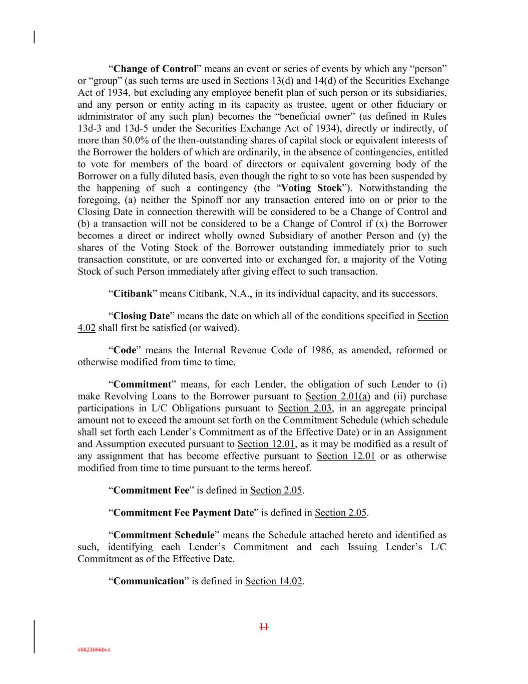 “Change of Control” means an event or series of events by which any “person” or “group” (as such terms are used in Sections 13(d) and 14(d) of the Securities Exchange Act of 1934, but excluding any employee benefit plan of such person or its subsidiaries, and any person or entity acting in its capacity as trustee, agent or other fiduciary or administrator of any such plan) becomes the “beneficial owner” (as defined in Rules 13d-3 and 13d-5 under the Securities Exchange Act of 1934), directly or indirectly, of more than 50.0% of the then-outstanding shares of capital stock or equivalent interests of the Borrower the holders of which are ordinarily, in the absence of contingencies, entitled to vote for members of the board of directors or equivalent governing body of the Borrower on a fully diluted basis, even though the right to so vote has been suspended by the happening of such a contingency (the “Voting Stock”). Notwithstanding the foregoing, (a) neither the Spinoff nor any transaction entered into on or prior to the Closing Date in connection therewith will be considered to be a Change of Control and (b) a transaction will not be considered to be a Change of Control if (x) the Borrower becomes a direct or indirect wholly owned Subsidiary of another Person and (y) the shares of the Voting Stock of the Borrower outstanding immediately prior to such transaction constitute, or are converted into or exchanged for, a majority of the Voting Stock of such Person immediately after giving effect to such transaction. “Citibank” means Citibank, N.A., in its individual capacity, and its successors. “Closing Date” means the date on which all of the conditions specified in Section 4.02 shall first be satisfied (or waived). “Code” means the Internal Revenue Code of 1986, as amended, reformed or otherwise modified from time to time. “Commitment” means, for each Lender, the obligation of such Lender to (i) make Revolving Loans to the Borrower pursuant to Section 2.01(a) and (ii) purchase participations in L/C Obligations pursuant to Section 2.03, in an aggregate principal amount not to exceed the amount set forth on the Commitment Schedule (which schedule shall set forth each Lender’s Commitment as of the Effective Date) or in an Assignment and Assumption executed pursuant to Section 12.01, as it may be modified as a result of any assignment that has become effective pursuant to Section 12.01 or as otherwise modified from time to time pursuant to the terms hereof. “Commitment Fee” is defined in Section 2.05. “Commitment Fee Payment Date” is defined in Section 2.05. “Commitment Schedule” means the Schedule attached hereto and identified as such, identifying each Lender’s Commitment and each Issuing Lender’s L/C Commitment as of the Effective Date. “Communication” is defined in Section 14.02. 11 #98230960v1