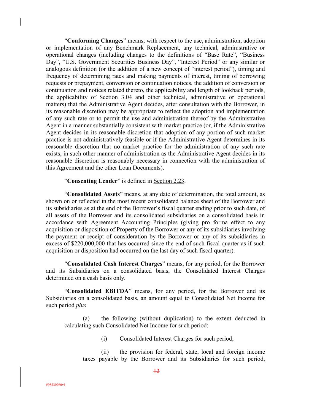 “Conforming Changes” means, with respect to the use, administration, adoption or implementation of any Benchmark Replacement, any technical, administrative or operational changes (including changes to the definitions of “Base Rate”, “Business Day”, “U.S. Government Securities Business Day”, “Interest Period” or any similar or analogous definition (or the addition of a new concept of “interest period”), timing and frequency of determining rates and making payments of interest, timing of borrowing requests or prepayment, conversion or continuation notices, the addition of conversion or continuation and notices related thereto, the applicability and length of lookback periods, the applicability of Section 3.04 and other technical, administrative or operational matters) that the Administrative Agent decides, after consultation with the Borrower, in its reasonable discretion may be appropriate to reflect the adoption and implementation of any such rate or to permit the use and administration thereof by the Administrative Agent in a manner substantially consistent with market practice (or, if the Administrative Agent decides in its reasonable discretion that adoption of any portion of such market practice is not administratively feasible or if the Administrative Agent determines in its reasonable discretion that no market practice for the administration of any such rate exists, in such other manner of administration as the Administrative Agent decides in its reasonable discretion is reasonably necessary in connection with the administration of this Agreement and the other Loan Documents). “Consenting Lender” is defined in Section 2.23. “Consolidated Assets” means, at any date of determination, the total amount, as shown on or reflected in the most recent consolidated balance sheet of the Borrower and its subsidiaries as at the end of the Borrower’s fiscal quarter ending prior to such date, of all assets of the Borrower and its consolidated subsidiaries on a consolidated basis in accordance with Agreement Accounting Principles (giving pro forma effect to any acquisition or disposition of Property of the Borrower or any of its subsidiaries involving the payment or receipt of consideration by the Borrower or any of its subsidiaries in excess of $220,000,000 that has occurred since the end of such fiscal quarter as if such acquisition or disposition had occurred on the last day of such fiscal quarter). “Consolidated Cash Interest Charges” means, for any period, for the Borrower and its Subsidiaries on a consolidated basis, the Consolidated Interest Charges determined on a cash basis only. “Consolidated EBITDA” means, for any period, for the Borrower and its Subsidiaries on a consolidated basis, an amount equal to Consolidated Net Income for such period plus (a) the following (without duplication) to the extent deducted in calculating such Consolidated Net Income for such period: (i) Consolidated Interest Charges for such period; (ii) the provision for federal, state, local and foreign income taxes payable by the Borrower and its Subsidiaries for such period, 12 #98230960v1