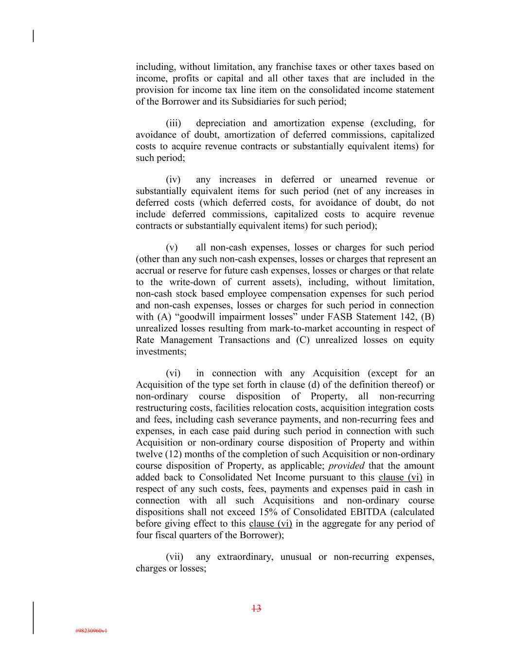 including, without limitation, any franchise taxes or other taxes based on income, profits or capital and all other taxes that are included in the provision for income tax line item on the consolidated income statement of the Borrower and its Subsidiaries for such period; (iii) depreciation and amortization expense (excluding, for avoidance of doubt, amortization of deferred commissions, capitalized costs to acquire revenue contracts or substantially equivalent items) for such period; (iv) any increases in deferred or unearned revenue or substantially equivalent items for such period (net of any increases in deferred costs (which deferred costs, for avoidance of doubt, do not include deferred commissions, capitalized costs to acquire revenue contracts or substantially equivalent items) for such period); (v) all non-cash expenses, losses or charges for such period (other than any such non-cash expenses, losses or charges that represent an accrual or reserve for future cash expenses, losses or charges or that relate to the write-down of current assets), including, without limitation, non-cash stock based employee compensation expenses for such period and non-cash expenses, losses or charges for such period in connection with (A) “goodwill impairment losses” under FASB Statement 142, (B) unrealized losses resulting from mark-to-market accounting in respect of Rate Management Transactions and (C) unrealized losses on equity investments; (vi) in connection with any Acquisition (except for an Acquisition of the type set forth in clause (d) of the definition thereof) or non-ordinary course disposition of Property, all non-recurring restructuring costs, facilities relocation costs, acquisition integration costs and fees, including cash severance payments, and non-recurring fees and expenses, in each case paid during such period in connection with such Acquisition or non-ordinary course disposition of Property and within twelve (12) months of the completion of such Acquisition or non-ordinary course disposition of Property, as applicable; provided that the amount added back to Consolidated Net Income pursuant to this clause (vi) in respect of any such costs, fees, payments and expenses paid in cash in connection with all such Acquisitions and non-ordinary course dispositions shall not exceed 15% of Consolidated EBITDA (calculated before giving effect to this clause (vi) in the aggregate for any period of four fiscal quarters of the Borrower); (vii) any extraordinary, unusual or non-recurring expenses, charges or losses; 13 #98230960v1
