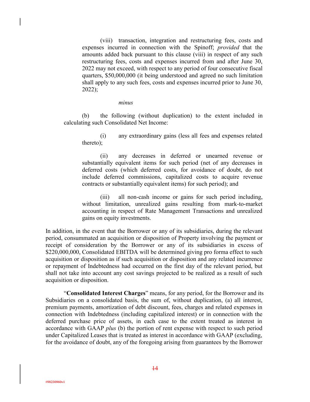 (viii) transaction, integration and restructuring fees, costs and expenses incurred in connection with the Spinoff; provided that the amounts added back pursuant to this clause (viii) in respect of any such restructuring fees, costs and expenses incurred from and after June 30, 2022 may not exceed, with respect to any period of four consecutive fiscal quarters, $50,000,000 (it being understood and agreed no such limitation shall apply to any such fees, costs and expenses incurred prior to June 30, 2022); minus (b) the following (without duplication) to the extent included in calculating such Consolidated Net Income: (i) any extraordinary gains (less all fees and expenses related thereto); (ii) any decreases in deferred or unearned revenue or substantially equivalent items for such period (net of any decreases in deferred costs (which deferred costs, for avoidance of doubt, do not include deferred commissions, capitalized costs to acquire revenue contracts or substantially equivalent items) for such period); and (iii) all non-cash income or gains for such period including, without limitation, unrealized gains resulting from mark-to-market accounting in respect of Rate Management Transactions and unrealized gains on equity investments. In addition, in the event that the Borrower or any of its subsidiaries, during the relevant period, consummated an acquisition or disposition of Property involving the payment or receipt of consideration by the Borrower or any of its subsidiaries in excess of $220,000,000, Consolidated EBITDA will be determined giving pro forma effect to such acquisition or disposition as if such acquisition or disposition and any related incurrence or repayment of Indebtedness had occurred on the first day of the relevant period, but shall not take into account any cost savings projected to be realized as a result of such acquisition or disposition. “Consolidated Interest Charges” means, for any period, for the Borrower and its Subsidiaries on a consolidated basis, the sum of, without duplication, (a) all interest, premium payments, amortization of debt discount, fees, charges and related expenses in connection with Indebtedness (including capitalized interest) or in connection with the deferred purchase price of assets, in each case to the extent treated as interest in accordance with GAAP plus (b) the portion of rent expense with respect to such period under Capitalized Leases that is treated as interest in accordance with GAAP (excluding, for the avoidance of doubt, any of the foregoing arising from guarantees by the Borrower 14 #98230960v1