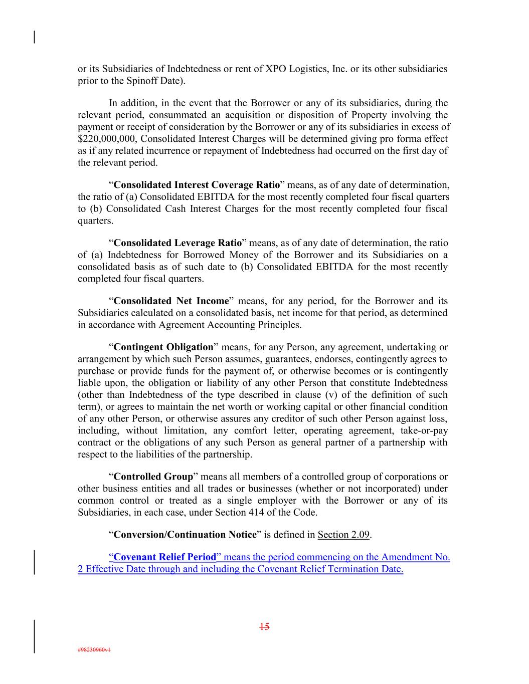 or its Subsidiaries of Indebtedness or rent of XPO Logistics, Inc. or its other subsidiaries prior to the Spinoff Date). In addition, in the event that the Borrower or any of its subsidiaries, during the relevant period, consummated an acquisition or disposition of Property involving the payment or receipt of consideration by the Borrower or any of its subsidiaries in excess of $220,000,000, Consolidated Interest Charges will be determined giving pro forma effect as if any related incurrence or repayment of Indebtedness had occurred on the first day of the relevant period. “Consolidated Interest Coverage Ratio” means, as of any date of determination, the ratio of (a) Consolidated EBITDA for the most recently completed four fiscal quarters to (b) Consolidated Cash Interest Charges for the most recently completed four fiscal quarters. “Consolidated Leverage Ratio” means, as of any date of determination, the ratio of (a) Indebtedness for Borrowed Money of the Borrower and its Subsidiaries on a consolidated basis as of such date to (b) Consolidated EBITDA for the most recently completed four fiscal quarters. “Consolidated Net Income” means, for any period, for the Borrower and its Subsidiaries calculated on a consolidated basis, net income for that period, as determined in accordance with Agreement Accounting Principles. “Contingent Obligation” means, for any Person, any agreement, undertaking or arrangement by which such Person assumes, guarantees, endorses, contingently agrees to purchase or provide funds for the payment of, or otherwise becomes or is contingently liable upon, the obligation or liability of any other Person that constitute Indebtedness (other than Indebtedness of the type described in clause (v) of the definition of such term), or agrees to maintain the net worth or working capital or other financial condition of any other Person, or otherwise assures any creditor of such other Person against loss, including, without limitation, any comfort letter, operating agreement, take-or-pay contract or the obligations of any such Person as general partner of a partnership with respect to the liabilities of the partnership. “Controlled Group” means all members of a controlled group of corporations or other business entities and all trades or businesses (whether or not incorporated) under common control or treated as a single employer with the Borrower or any of its Subsidiaries, in each case, under Section 414 of the Code. “Conversion/Continuation Notice” is defined in Section 2.09. “Covenant Relief Period” means the period commencing on the Amendment No. 2 Effective Date through and including the Covenant Relief Termination Date. 15 #98230960v1