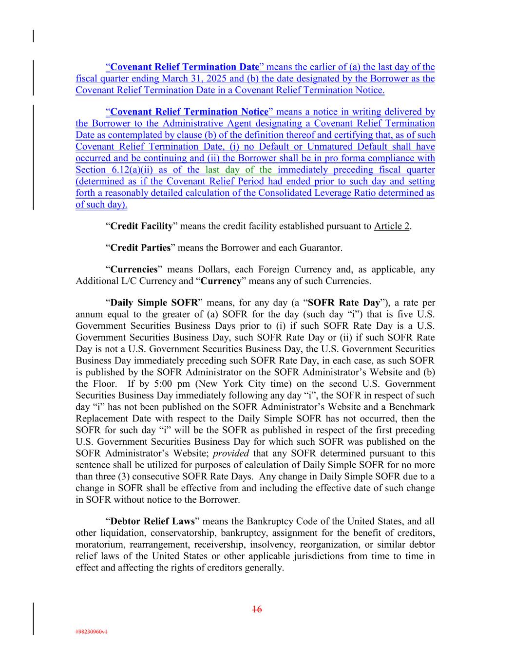“Covenant Relief Termination Date” means the earlier of (a) the last day of the fiscal quarter ending March 31, 2025 and (b) the date designated by the Borrower as the Covenant Relief Termination Date in a Covenant Relief Termination Notice. “Covenant Relief Termination Notice” means a notice in writing delivered by the Borrower to the Administrative Agent designating a Covenant Relief Termination Date as contemplated by clause (b) of the definition thereof and certifying that, as of such Covenant Relief Termination Date, (i) no Default or Unmatured Default shall have occurred and be continuing and (ii) the Borrower shall be in pro forma compliance with Section 6.12(a)(ii) as of the last day of the immediately preceding fiscal quarter (determined as if the Covenant Relief Period had ended prior to such day and setting forth a reasonably detailed calculation of the Consolidated Leverage Ratio determined as of such day). “Credit Facility” means the credit facility established pursuant to Article 2. “Credit Parties” means the Borrower and each Guarantor. “Currencies” means Dollars, each Foreign Currency and, as applicable, any Additional L/C Currency and “Currency” means any of such Currencies. “Daily Simple SOFR” means, for any day (a “SOFR Rate Day”), a rate per annum equal to the greater of (a) SOFR for the day (such day “i”) that is five U.S. Government Securities Business Days prior to (i) if such SOFR Rate Day is a U.S. Government Securities Business Day, such SOFR Rate Day or (ii) if such SOFR Rate Day is not a U.S. Government Securities Business Day, the U.S. Government Securities Business Day immediately preceding such SOFR Rate Day, in each case, as such SOFR is published by the SOFR Administrator on the SOFR Administrator’s Website and (b) the Floor. If by 5:00 pm (New York City time) on the second U.S. Government Securities Business Day immediately following any day “i”, the SOFR in respect of such day “i” has not been published on the SOFR Administrator’s Website and a Benchmark Replacement Date with respect to the Daily Simple SOFR has not occurred, then the SOFR for such day “i” will be the SOFR as published in respect of the first preceding U.S. Government Securities Business Day for which such SOFR was published on the SOFR Administrator’s Website; provided that any SOFR determined pursuant to this sentence shall be utilized for purposes of calculation of Daily Simple SOFR for no more than three (3) consecutive SOFR Rate Days. Any change in Daily Simple SOFR due to a change in SOFR shall be effective from and including the effective date of such change in SOFR without notice to the Borrower. “Debtor Relief Laws” means the Bankruptcy Code of the United States, and all other liquidation, conservatorship, bankruptcy, assignment for the benefit of creditors, moratorium, rearrangement, receivership, insolvency, reorganization, or similar debtor relief laws of the United States or other applicable jurisdictions from time to time in effect and affecting the rights of creditors generally. 16 #98230960v1