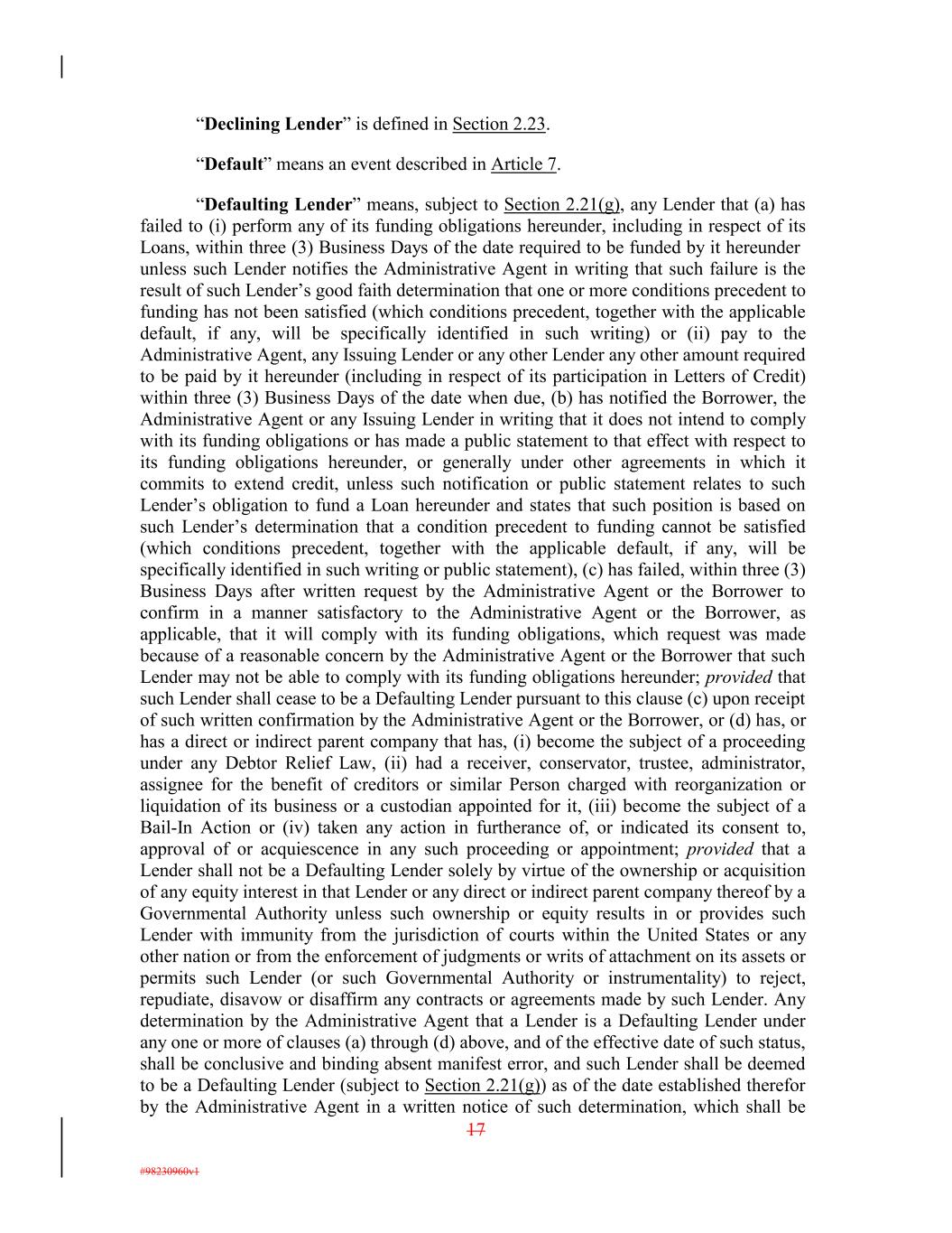 “Declining Lender” is defined in Section 2.23. “Default” means an event described in Article 7. “Defaulting Lender” means, subject to Section 2.21(g), any Lender that (a) has failed to (i) perform any of its funding obligations hereunder, including in respect of its Loans, within three (3) Business Days of the date required to be funded by it hereunder unless such Lender notifies the Administrative Agent in writing that such failure is the result of such Lender’s good faith determination that one or more conditions precedent to funding has not been satisfied (which conditions precedent, together with the applicable default, if any, will be specifically identified in such writing) or (ii) pay to the Administrative Agent, any Issuing Lender or any other Lender any other amount required to be paid by it hereunder (including in respect of its participation in Letters of Credit) within three (3) Business Days of the date when due, (b) has notified the Borrower, the Administrative Agent or any Issuing Lender in writing that it does not intend to comply with its funding obligations or has made a public statement to that effect with respect to its funding obligations hereunder, or generally under other agreements in which it commits to extend credit, unless such notification or public statement relates to such Lender’s obligation to fund a Loan hereunder and states that such position is based on such Lender’s determination that a condition precedent to funding cannot be satisfied (which conditions precedent, together with the applicable default, if any, will be specifically identified in such writing or public statement), (c) has failed, within three (3) Business Days after written request by the Administrative Agent or the Borrower to confirm in a manner satisfactory to the Administrative Agent or the Borrower, as applicable, that it will comply with its funding obligations, which request was made because of a reasonable concern by the Administrative Agent or the Borrower that such Lender may not be able to comply with its funding obligations hereunder; provided that such Lender shall cease to be a Defaulting Lender pursuant to this clause (c) upon receipt of such written confirmation by the Administrative Agent or the Borrower, or (d) has, or has a direct or indirect parent company that has, (i) become the subject of a proceeding under any Debtor Relief Law, (ii) had a receiver, conservator, trustee, administrator, assignee for the benefit of creditors or similar Person charged with reorganization or liquidation of its business or a custodian appointed for it, (iii) become the subject of a Bail-In Action or (iv) taken any action in furtherance of, or indicated its consent to, approval of or acquiescence in any such proceeding or appointment; provided that a Lender shall not be a Defaulting Lender solely by virtue of the ownership or acquisition of any equity interest in that Lender or any direct or indirect parent company thereof by a Governmental Authority unless such ownership or equity results in or provides such Lender with immunity from the jurisdiction of courts within the United States or any other nation or from the enforcement of judgments or writs of attachment on its assets or permits such Lender (or such Governmental Authority or instrumentality) to reject, repudiate, disavow or disaffirm any contracts or agreements made by such Lender. Any determination by the Administrative Agent that a Lender is a Defaulting Lender under any one or more of clauses (a) through (d) above, and of the effective date of such status, shall be conclusive and binding absent manifest error, and such Lender shall be deemed to be a Defaulting Lender (subject to Section 2.21(g)) as of the date established therefor by the Administrative Agent in a written notice of such determination, which shall be 17 #98230960v1