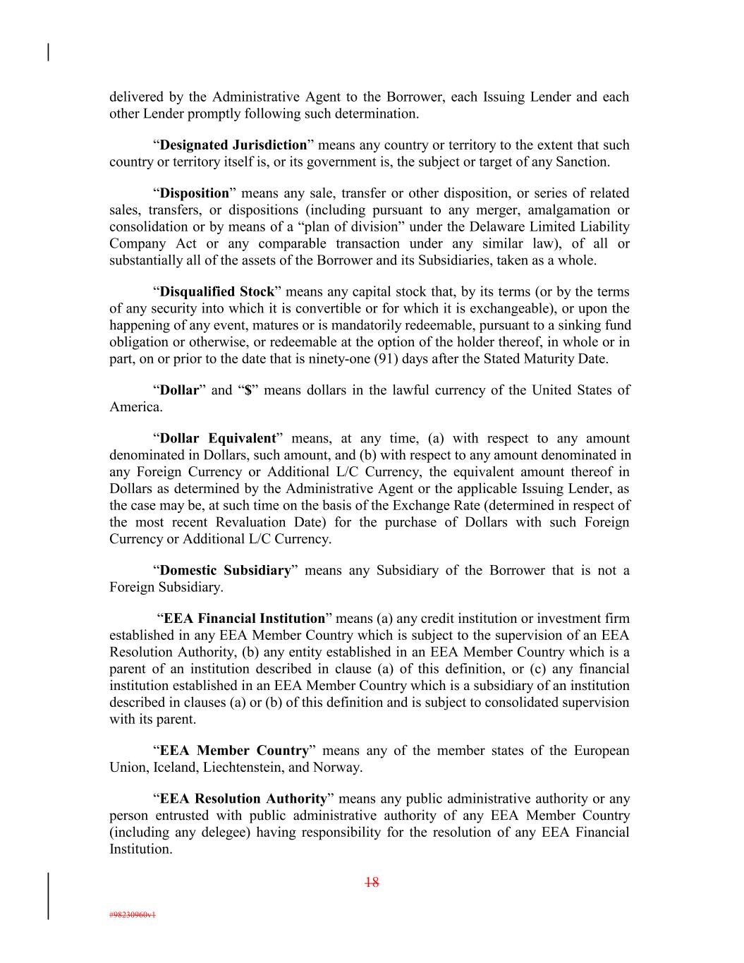 delivered by the Administrative Agent to the Borrower, each Issuing Lender and each other Lender promptly following such determination. “Designated Jurisdiction” means any country or territory to the extent that such country or territory itself is, or its government is, the subject or target of any Sanction. “Disposition” means any sale, transfer or other disposition, or series of related sales, transfers, or dispositions (including pursuant to any merger, amalgamation or consolidation or by means of a “plan of division” under the Delaware Limited Liability Company Act or any comparable transaction under any similar law), of all or substantially all of the assets of the Borrower and its Subsidiaries, taken as a whole. “Disqualified Stock” means any capital stock that, by its terms (or by the terms of any security into which it is convertible or for which it is exchangeable), or upon the happening of any event, matures or is mandatorily redeemable, pursuant to a sinking fund obligation or otherwise, or redeemable at the option of the holder thereof, in whole or in part, on or prior to the date that is ninety-one (91) days after the Stated Maturity Date. “Dollar” and “$” means dollars in the lawful currency of the United States of America. “Dollar Equivalent” means, at any time, (a) with respect to any amount denominated in Dollars, such amount, and (b) with respect to any amount denominated in any Foreign Currency or Additional L/C Currency, the equivalent amount thereof in Dollars as determined by the Administrative Agent or the applicable Issuing Lender, as the case may be, at such time on the basis of the Exchange Rate (determined in respect of the most recent Revaluation Date) for the purchase of Dollars with such Foreign Currency or Additional L/C Currency. “Domestic Subsidiary” means any Subsidiary of the Borrower that is not a Foreign Subsidiary. “EEA Financial Institution” means (a) any credit institution or investment firm established in any EEA Member Country which is subject to the supervision of an EEA Resolution Authority, (b) any entity established in an EEA Member Country which is a parent of an institution described in clause (a) of this definition, or (c) any financial institution established in an EEA Member Country which is a subsidiary of an institution described in clauses (a) or (b) of this definition and is subject to consolidated supervision with its parent. “EEA Member Country” means any of the member states of the European Union, Iceland, Liechtenstein, and Norway. “EEA Resolution Authority” means any public administrative authority or any person entrusted with public administrative authority of any EEA Member Country (including any delegee) having responsibility for the resolution of any EEA Financial Institution. 18 #98230960v1