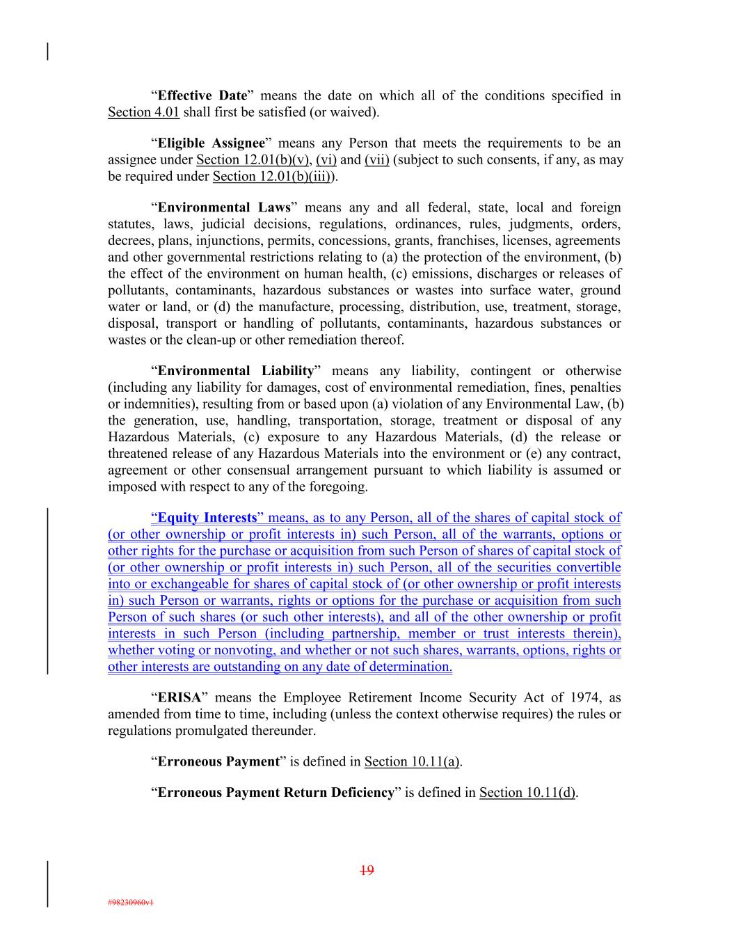 “Effective Date” means the date on which all of the conditions specified in Section 4.01 shall first be satisfied (or waived). “Eligible Assignee” means any Person that meets the requirements to be an assignee under Section 12.01(b)(v), (vi) and (vii) (subject to such consents, if any, as may be required under Section 12.01(b)(iii)). “Environmental Laws” means any and all federal, state, local and foreign statutes, laws, judicial decisions, regulations, ordinances, rules, judgments, orders, decrees, plans, injunctions, permits, concessions, grants, franchises, licenses, agreements and other governmental restrictions relating to (a) the protection of the environment, (b) the effect of the environment on human health, (c) emissions, discharges or releases of pollutants, contaminants, hazardous substances or wastes into surface water, ground water or land, or (d) the manufacture, processing, distribution, use, treatment, storage, disposal, transport or handling of pollutants, contaminants, hazardous substances or wastes or the clean-up or other remediation thereof. “Environmental Liability” means any liability, contingent or otherwise (including any liability for damages, cost of environmental remediation, fines, penalties or indemnities), resulting from or based upon (a) violation of any Environmental Law, (b) the generation, use, handling, transportation, storage, treatment or disposal of any Hazardous Materials, (c) exposure to any Hazardous Materials, (d) the release or threatened release of any Hazardous Materials into the environment or (e) any contract, agreement or other consensual arrangement pursuant to which liability is assumed or imposed with respect to any of the foregoing. “Equity Interests” means, as to any Person, all of the shares of capital stock of (or other ownership or profit interests in) such Person, all of the warrants, options or other rights for the purchase or acquisition from such Person of shares of capital stock of (or other ownership or profit interests in) such Person, all of the securities convertible into or exchangeable for shares of capital stock of (or other ownership or profit interests in) such Person or warrants, rights or options for the purchase or acquisition from such Person of such shares (or such other interests), and all of the other ownership or profit interests in such Person (including partnership, member or trust interests therein), whether voting or nonvoting, and whether or not such shares, warrants, options, rights or other interests are outstanding on any date of determination. “ERISA” means the Employee Retirement Income Security Act of 1974, as amended from time to time, including (unless the context otherwise requires) the rules or regulations promulgated thereunder. “Erroneous Payment” is defined in Section 10.11(a). “Erroneous Payment Return Deficiency” is defined in Section 10.11(d). 19 #98230960v1