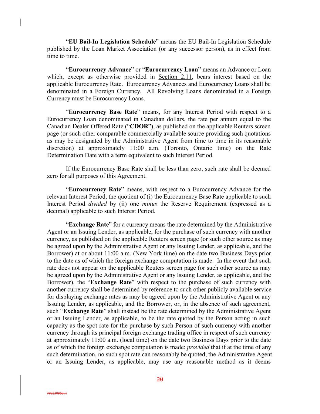 “EU Bail-In Legislation Schedule” means the EU Bail-In Legislation Schedule published by the Loan Market Association (or any successor person), as in effect from time to time. “Eurocurrency Advance” or “Eurocurrency Loan” means an Advance or Loan which, except as otherwise provided in Section 2.11, bears interest based on the applicable Eurocurrency Rate. Eurocurrency Advances and Eurocurrency Loans shall be denominated in a Foreign Currency. All Revolving Loans denominated in a Foreign Currency must be Eurocurrency Loans. “Eurocurrency Base Rate” means, for any Interest Period with respect to a Eurocurrency Loan denominated in Canadian dollars, the rate per annum equal to the Canadian Dealer Offered Rate (“CDOR”), as published on the applicable Reuters screen page (or such other comparable commercially available source providing such quotations as may be designated by the Administrative Agent from time to time in its reasonable discretion) at approximately 11:00 a.m. (Toronto, Ontario time) on the Rate Determination Date with a term equivalent to such Interest Period. If the Eurocurrency Base Rate shall be less than zero, such rate shall be deemed zero for all purposes of this Agreement. “Eurocurrency Rate” means, with respect to a Eurocurrency Advance for the relevant Interest Period, the quotient of (i) the Eurocurrency Base Rate applicable to such Interest Period divided by (ii) one minus the Reserve Requirement (expressed as a decimal) applicable to such Interest Period. “Exchange Rate” for a currency means the rate determined by the Administrative Agent or an Issuing Lender, as applicable, for the purchase of such currency with another currency, as published on the applicable Reuters screen page (or such other source as may be agreed upon by the Administrative Agent or any Issuing Lender, as applicable, and the Borrower) at or about 11:00 a.m. (New York time) on the date two Business Days prior to the date as of which the foreign exchange computation is made. In the event that such rate does not appear on the applicable Reuters screen page (or such other source as may be agreed upon by the Administrative Agent or any Issuing Lender, as applicable, and the Borrower), the “Exchange Rate” with respect to the purchase of such currency with another currency shall be determined by reference to such other publicly available service for displaying exchange rates as may be agreed upon by the Administrative Agent or any Issuing Lender, as applicable, and the Borrower, or, in the absence of such agreement, such “Exchange Rate” shall instead be the rate determined by the Administrative Agent or an Issuing Lender, as applicable, to be the rate quoted by the Person acting in such capacity as the spot rate for the purchase by such Person of such currency with another currency through its principal foreign exchange trading office in respect of such currency at approximately 11:00 a.m. (local time) on the date two Business Days prior to the date as of which the foreign exchange computation is made; provided that if at the time of any such determination, no such spot rate can reasonably be quoted, the Administrative Agent or an Issuing Lender, as applicable, may use any reasonable method as it deems 20 #98230960v1