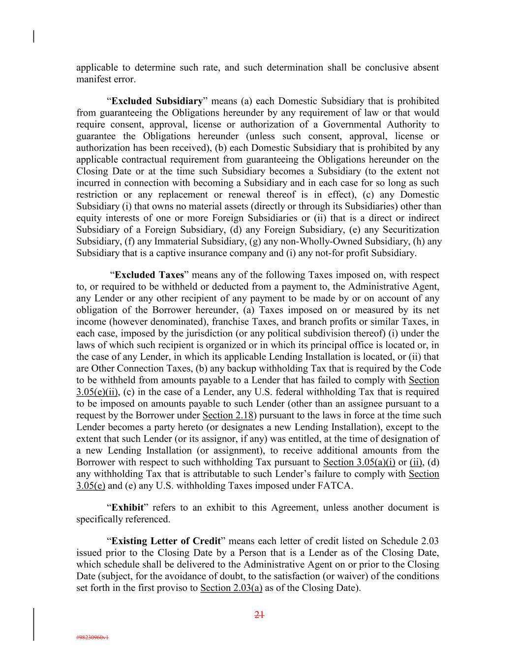 applicable to determine such rate, and such determination shall be conclusive absent manifest error. “Excluded Subsidiary” means (a) each Domestic Subsidiary that is prohibited from guaranteeing the Obligations hereunder by any requirement of law or that would require consent, approval, license or authorization of a Governmental Authority to guarantee the Obligations hereunder (unless such consent, approval, license or authorization has been received), (b) each Domestic Subsidiary that is prohibited by any applicable contractual requirement from guaranteeing the Obligations hereunder on the Closing Date or at the time such Subsidiary becomes a Subsidiary (to the extent not incurred in connection with becoming a Subsidiary and in each case for so long as such restriction or any replacement or renewal thereof is in effect), (c) any Domestic Subsidiary (i) that owns no material assets (directly or through its Subsidiaries) other than equity interests of one or more Foreign Subsidiaries or (ii) that is a direct or indirect Subsidiary of a Foreign Subsidiary, (d) any Foreign Subsidiary, (e) any Securitization Subsidiary, (f) any Immaterial Subsidiary, (g) any non-Wholly-Owned Subsidiary, (h) any Subsidiary that is a captive insurance company and (i) any not-for profit Subsidiary. “Excluded Taxes” means any of the following Taxes imposed on, with respect to, or required to be withheld or deducted from a payment to, the Administrative Agent, any Lender or any other recipient of any payment to be made by or on account of any obligation of the Borrower hereunder, (a) Taxes imposed on or measured by its net income (however denominated), franchise Taxes, and branch profits or similar Taxes, in each case, imposed by the jurisdiction (or any political subdivision thereof) (i) under the laws of which such recipient is organized or in which its principal office is located or, in the case of any Lender, in which its applicable Lending Installation is located, or (ii) that are Other Connection Taxes, (b) any backup withholding Tax that is required by the Code to be withheld from amounts payable to a Lender that has failed to comply with Section 3.05(e)(ii), (c) in the case of a Lender, any U.S. federal withholding Tax that is required to be imposed on amounts payable to such Lender (other than an assignee pursuant to a request by the Borrower under Section 2.18) pursuant to the laws in force at the time such Lender becomes a party hereto (or designates a new Lending Installation), except to the extent that such Lender (or its assignor, if any) was entitled, at the time of designation of a new Lending Installation (or assignment), to receive additional amounts from the Borrower with respect to such withholding Tax pursuant to Section 3.05(a)(i) or (ii), (d) any withholding Tax that is attributable to such Lender’s failure to comply with Section 3.05(e) and (e) any U.S. withholding Taxes imposed under FATCA. “Exhibit” refers to an exhibit to this Agreement, unless another document is specifically referenced. “Existing Letter of Credit” means each letter of credit listed on Schedule 2.03 issued prior to the Closing Date by a Person that is a Lender as of the Closing Date, which schedule shall be delivered to the Administrative Agent on or prior to the Closing Date (subject, for the avoidance of doubt, to the satisfaction (or waiver) of the conditions set forth in the first proviso to Section 2.03(a) as of the Closing Date). 21 #98230960v1