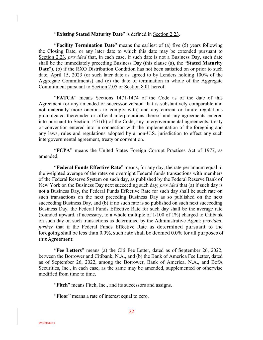 “Existing Stated Maturity Date” is defined in Section 2.23. “Facility Termination Date” means the earliest of (a) five (5) years following the Closing Date, or any later date to which this date may be extended pursuant to Section 2.23, provided that, in each case, if such date is not a Business Day, such date shall be the immediately preceding Business Day (this clause (a), the “Stated Maturity Date”), (b) if the RXO Distribution Condition has not been satisfied on or prior to such date, April 15, 2023 (or such later date as agreed to by Lenders holding 100% of the Aggregate Commitments) and (c) the date of termination in whole of the Aggregate Commitment pursuant to Section 2.05 or Section 8.01 hereof. “FATCA” means Sections 1471-1474 of the Code as of the date of this Agreement (or any amended or successor version that is substantively comparable and not materially more onerous to comply with) and any current or future regulations promulgated thereunder or official interpretations thereof and any agreements entered into pursuant to Section 1471(b) of the Code, any intergovernmental agreements, treaty or convention entered into in connection with the implementation of the foregoing and any laws, rules and regulations adopted by a non-U.S. jurisdiction to effect any such intergovernmental agreement, treaty or convention. “FCPA” means the United States Foreign Corrupt Practices Act of 1977, as amended. “Federal Funds Effective Rate” means, for any day, the rate per annum equal to the weighted average of the rates on overnight Federal funds transactions with members of the Federal Reserve System on such day, as published by the Federal Reserve Bank of New York on the Business Day next succeeding such day; provided that (a) if such day is not a Business Day, the Federal Funds Effective Rate for such day shall be such rate on such transactions on the next preceding Business Day as so published on the next succeeding Business Day, and (b) if no such rate is so published on such next succeeding Business Day, the Federal Funds Effective Rate for such day shall be the average rate (rounded upward, if necessary, to a whole multiple of 1/100 of 1%) charged to Citibank on such day on such transactions as determined by the Administrative Agent; provided, further that if the Federal Funds Effective Rate as determined pursuant to the foregoing shall be less than 0.0%, such rate shall be deemed 0.0% for all purposes of this Agreement. “Fee Letters” means (a) the Citi Fee Letter, dated as of September 26, 2022, between the Borrower and Citibank, N.A., and (b) the Bank of America Fee Letter, dated as of September 26, 2022, among the Borrower, Bank of America, N.A., and BofA Securities, Inc., in each case, as the same may be amended, supplemented or otherwise modified from time to time. “Fitch” means Fitch, Inc., and its successors and assigns. “Floor” means a rate of interest equal to zero. 22 #98230960v1