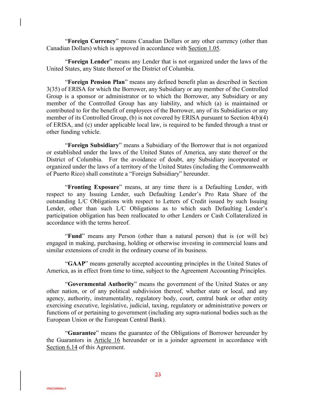 “Foreign Currency” means Canadian Dollars or any other currency (other than Canadian Dollars) which is approved in accordance with Section 1.05. “Foreign Lender” means any Lender that is not organized under the laws of the United States, any State thereof or the District of Columbia. “Foreign Pension Plan” means any defined benefit plan as described in Section 3(35) of ERISA for which the Borrower, any Subsidiary or any member of the Controlled Group is a sponsor or administrator or to which the Borrower, any Subsidiary or any member of the Controlled Group has any liability, and which (a) is maintained or contributed to for the benefit of employees of the Borrower, any of its Subsidiaries or any member of its Controlled Group, (b) is not covered by ERISA pursuant to Section 4(b)(4) of ERISA, and (c) under applicable local law, is required to be funded through a trust or other funding vehicle. “Foreign Subsidiary” means a Subsidiary of the Borrower that is not organized or established under the laws of the United States of America, any state thereof or the District of Columbia. For the avoidance of doubt, any Subsidiary incorporated or organized under the laws of a territory of the United States (including the Commonwealth of Puerto Rico) shall constitute a “Foreign Subsidiary” hereunder. “Fronting Exposure” means, at any time there is a Defaulting Lender, with respect to any Issuing Lender, such Defaulting Lender’s Pro Rata Share of the outstanding L/C Obligations with respect to Letters of Credit issued by such Issuing Lender, other than such L/C Obligations as to which such Defaulting Lender’s participation obligation has been reallocated to other Lenders or Cash Collateralized in accordance with the terms hereof. “Fund” means any Person (other than a natural person) that is (or will be) engaged in making, purchasing, holding or otherwise investing in commercial loans and similar extensions of credit in the ordinary course of its business. “GAAP” means generally accepted accounting principles in the United States of America, as in effect from time to time, subject to the Agreement Accounting Principles. “Governmental Authority” means the government of the United States or any other nation, or of any political subdivision thereof, whether state or local, and any agency, authority, instrumentality, regulatory body, court, central bank or other entity exercising executive, legislative, judicial, taxing, regulatory or administrative powers or functions of or pertaining to government (including any supra-national bodies such as the European Union or the European Central Bank). “Guarantee” means the guarantee of the Obligations of Borrower hereunder by the Guarantors in Article 16 hereunder or in a joinder agreement in accordance with Section 6.14 of this Agreement. 23 #98230960v1