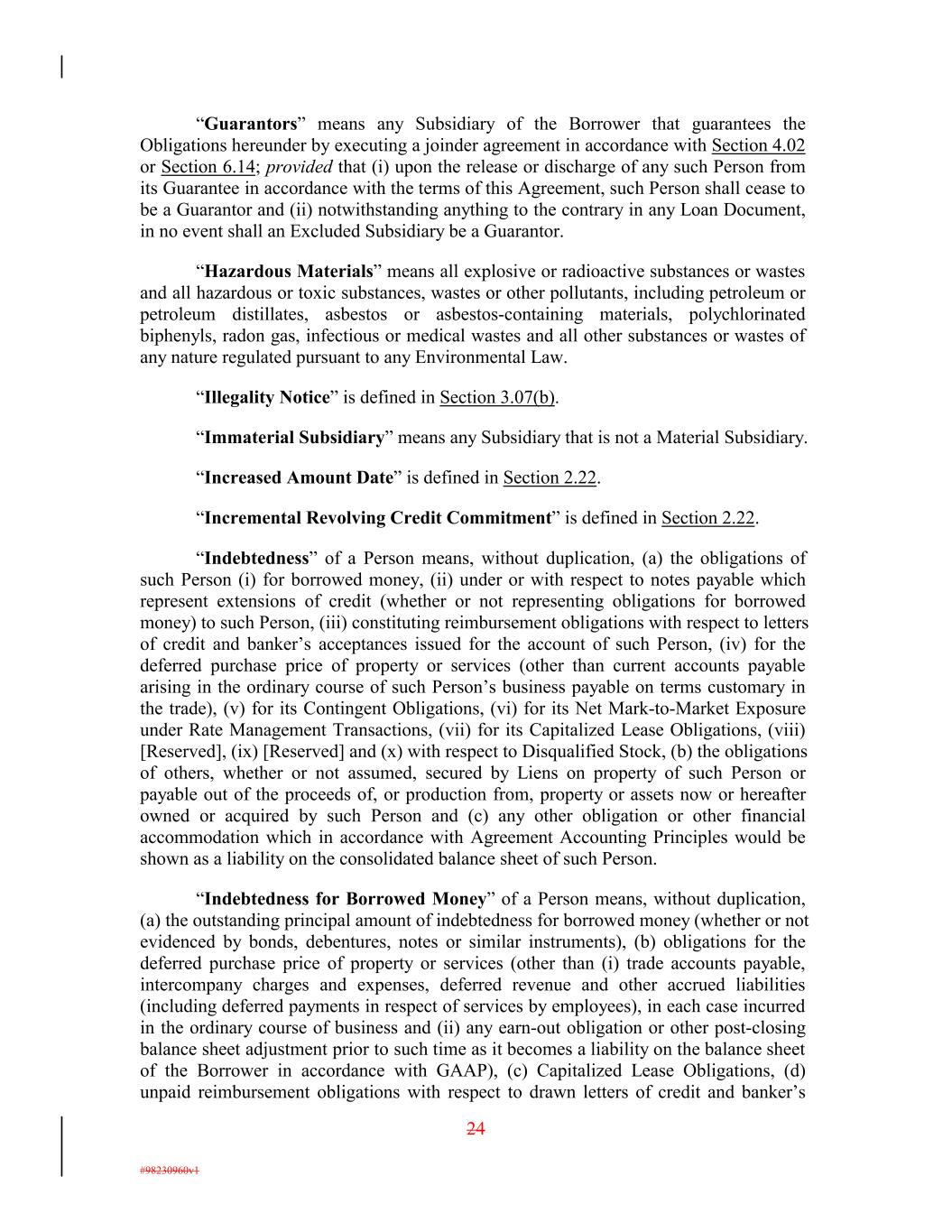 “Guarantors” means any Subsidiary of the Borrower that guarantees the Obligations hereunder by executing a joinder agreement in accordance with Section 4.02 or Section 6.14; provided that (i) upon the release or discharge of any such Person from its Guarantee in accordance with the terms of this Agreement, such Person shall cease to be a Guarantor and (ii) notwithstanding anything to the contrary in any Loan Document, in no event shall an Excluded Subsidiary be a Guarantor. “Hazardous Materials” means all explosive or radioactive substances or wastes and all hazardous or toxic substances, wastes or other pollutants, including petroleum or petroleum distillates, asbestos or asbestos-containing materials, polychlorinated biphenyls, radon gas, infectious or medical wastes and all other substances or wastes of any nature regulated pursuant to any Environmental Law. “Illegality Notice” is defined in Section 3.07(b). “Immaterial Subsidiary” means any Subsidiary that is not a Material Subsidiary. “Increased Amount Date” is defined in Section 2.22. “Incremental Revolving Credit Commitment” is defined in Section 2.22. “Indebtedness” of a Person means, without duplication, (a) the obligations of such Person (i) for borrowed money, (ii) under or with respect to notes payable which represent extensions of credit (whether or not representing obligations for borrowed money) to such Person, (iii) constituting reimbursement obligations with respect to letters of credit and banker’s acceptances issued for the account of such Person, (iv) for the deferred purchase price of property or services (other than current accounts payable arising in the ordinary course of such Person’s business payable on terms customary in the trade), (v) for its Contingent Obligations, (vi) for its Net Mark-to-Market Exposure under Rate Management Transactions, (vii) for its Capitalized Lease Obligations, (viii) [Reserved], (ix) [Reserved] and (x) with respect to Disqualified Stock, (b) the obligations of others, whether or not assumed, secured by Liens on property of such Person or payable out of the proceeds of, or production from, property or assets now or hereafter owned or acquired by such Person and (c) any other obligation or other financial accommodation which in accordance with Agreement Accounting Principles would be shown as a liability on the consolidated balance sheet of such Person. “Indebtedness for Borrowed Money” of a Person means, without duplication, (a) the outstanding principal amount of indebtedness for borrowed money (whether or not evidenced by bonds, debentures, notes or similar instruments), (b) obligations for the deferred purchase price of property or services (other than (i) trade accounts payable, intercompany charges and expenses, deferred revenue and other accrued liabilities (including deferred payments in respect of services by employees), in each case incurred in the ordinary course of business and (ii) any earn-out obligation or other post-closing balance sheet adjustment prior to such time as it becomes a liability on the balance sheet of the Borrower in accordance with GAAP), (c) Capitalized Lease Obligations, (d) unpaid reimbursement obligations with respect to drawn letters of credit and banker’s 24 #98230960v1