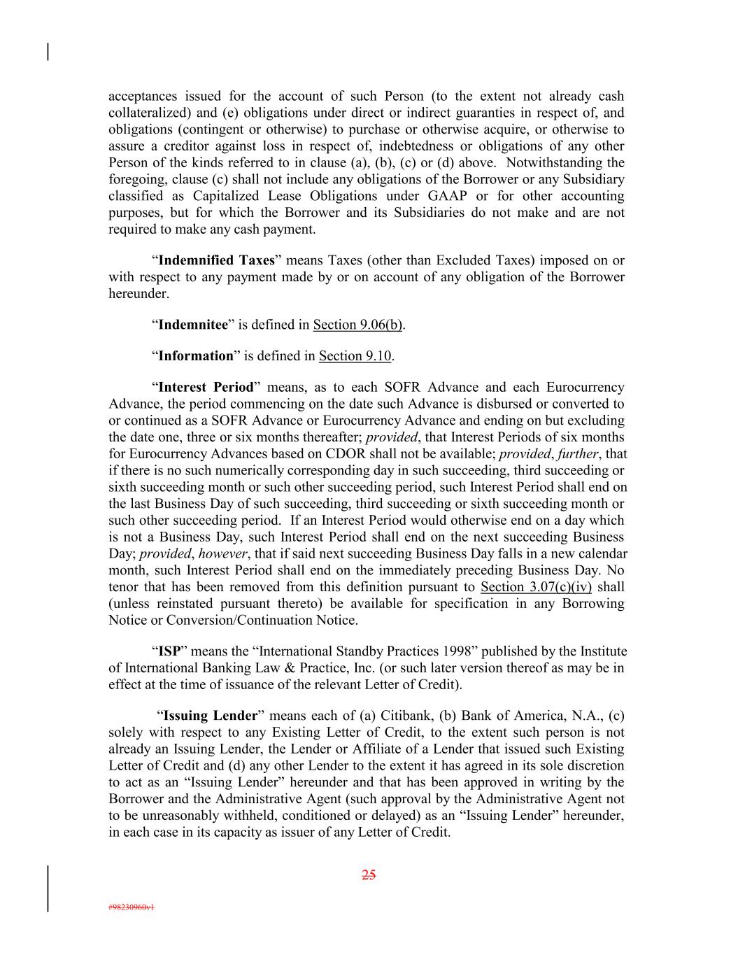 acceptances issued for the account of such Person (to the extent not already cash collateralized) and (e) obligations under direct or indirect guaranties in respect of, and obligations (contingent or otherwise) to purchase or otherwise acquire, or otherwise to assure a creditor against loss in respect of, indebtedness or obligations of any other Person of the kinds referred to in clause (a), (b), (c) or (d) above. Notwithstanding the foregoing, clause (c) shall not include any obligations of the Borrower or any Subsidiary classified as Capitalized Lease Obligations under GAAP or for other accounting purposes, but for which the Borrower and its Subsidiaries do not make and are not required to make any cash payment. “Indemnified Taxes” means Taxes (other than Excluded Taxes) imposed on or with respect to any payment made by or on account of any obligation of the Borrower hereunder. “Indemnitee” is defined in Section 9.06(b). “Information” is defined in Section 9.10. “Interest Period” means, as to each SOFR Advance and each Eurocurrency Advance, the period commencing on the date such Advance is disbursed or converted to or continued as a SOFR Advance or Eurocurrency Advance and ending on but excluding the date one, three or six months thereafter; provided, that Interest Periods of six months for Eurocurrency Advances based on CDOR shall not be available; provided, further, that if there is no such numerically corresponding day in such succeeding, third succeeding or sixth succeeding month or such other succeeding period, such Interest Period shall end on the last Business Day of such succeeding, third succeeding or sixth succeeding month or such other succeeding period. If an Interest Period would otherwise end on a day which is not a Business Day, such Interest Period shall end on the next succeeding Business Day; provided, however, that if said next succeeding Business Day falls in a new calendar month, such Interest Period shall end on the immediately preceding Business Day. No tenor that has been removed from this definition pursuant to Section 3.07(c)(iv) shall (unless reinstated pursuant thereto) be available for specification in any Borrowing Notice or Conversion/Continuation Notice. “ISP” means the “International Standby Practices 1998” published by the Institute of International Banking Law & Practice, Inc. (or such later version thereof as may be in effect at the time of issuance of the relevant Letter of Credit). “Issuing Lender” means each of (a) Citibank, (b) Bank of America, N.A., (c) solely with respect to any Existing Letter of Credit, to the extent such person is not already an Issuing Lender, the Lender or Affiliate of a Lender that issued such Existing Letter of Credit and (d) any other Lender to the extent it has agreed in its sole discretion to act as an “Issuing Lender” hereunder and that has been approved in writing by the Borrower and the Administrative Agent (such approval by the Administrative Agent not to be unreasonably withheld, conditioned or delayed) as an “Issuing Lender” hereunder, in each case in its capacity as issuer of any Letter of Credit. 25 #98230960v1
