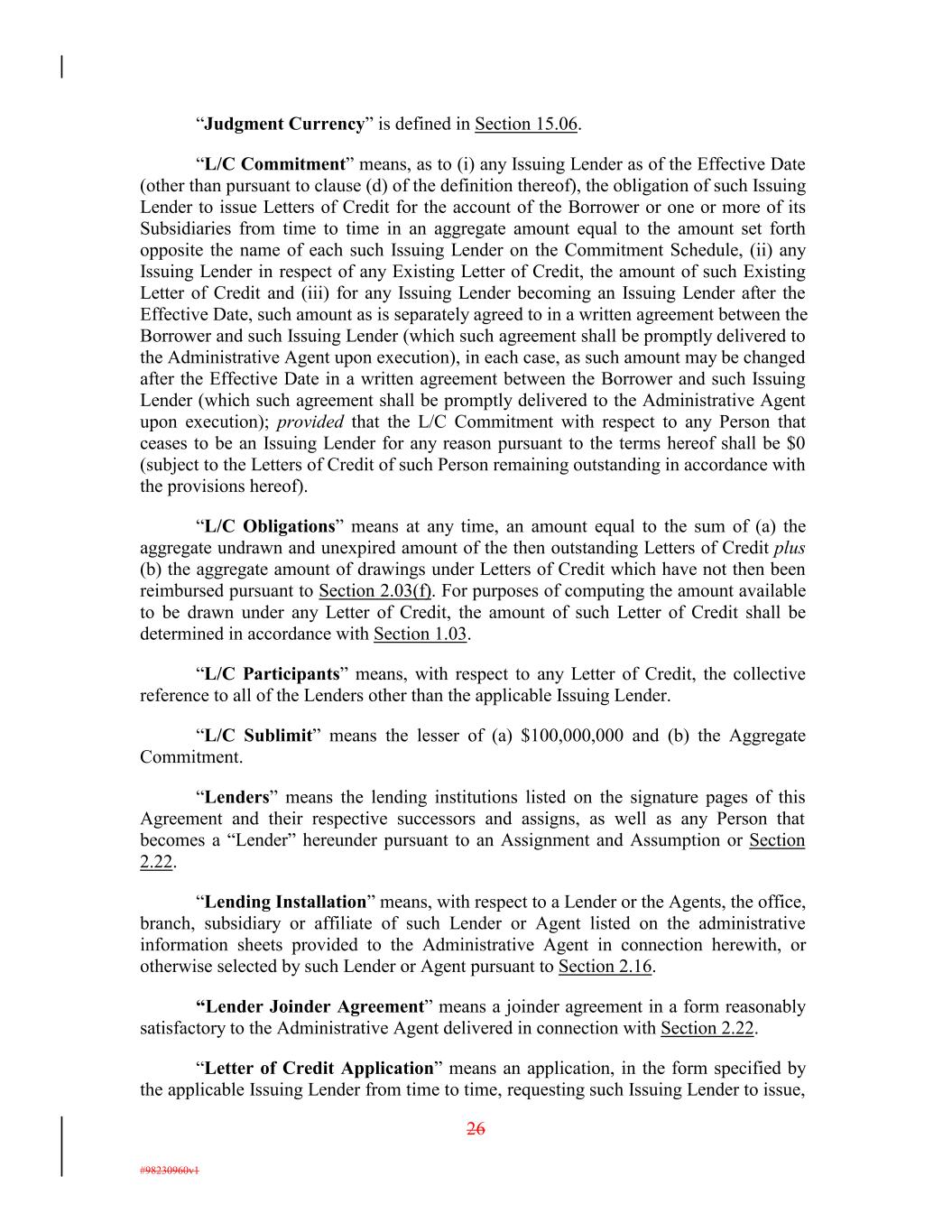 “Judgment Currency” is defined in Section 15.06. “L/C Commitment” means, as to (i) any Issuing Lender as of the Effective Date (other than pursuant to clause (d) of the definition thereof), the obligation of such Issuing Lender to issue Letters of Credit for the account of the Borrower or one or more of its Subsidiaries from time to time in an aggregate amount equal to the amount set forth opposite the name of each such Issuing Lender on the Commitment Schedule, (ii) any Issuing Lender in respect of any Existing Letter of Credit, the amount of such Existing Letter of Credit and (iii) for any Issuing Lender becoming an Issuing Lender after the Effective Date, such amount as is separately agreed to in a written agreement between the Borrower and such Issuing Lender (which such agreement shall be promptly delivered to the Administrative Agent upon execution), in each case, as such amount may be changed after the Effective Date in a written agreement between the Borrower and such Issuing Lender (which such agreement shall be promptly delivered to the Administrative Agent upon execution); provided that the L/C Commitment with respect to any Person that ceases to be an Issuing Lender for any reason pursuant to the terms hereof shall be $0 (subject to the Letters of Credit of such Person remaining outstanding in accordance with the provisions hereof). “L/C Obligations” means at any time, an amount equal to the sum of (a) the aggregate undrawn and unexpired amount of the then outstanding Letters of Credit plus (b) the aggregate amount of drawings under Letters of Credit which have not then been reimbursed pursuant to Section 2.03(f). For purposes of computing the amount available to be drawn under any Letter of Credit, the amount of such Letter of Credit shall be determined in accordance with Section 1.03. “L/C Participants” means, with respect to any Letter of Credit, the collective reference to all of the Lenders other than the applicable Issuing Lender. “L/C Sublimit” means the lesser of (a) $100,000,000 and (b) the Aggregate Commitment. “Lenders” means the lending institutions listed on the signature pages of this Agreement and their respective successors and assigns, as well as any Person that becomes a “Lender” hereunder pursuant to an Assignment and Assumption or Section 2.22. “Lending Installation” means, with respect to a Lender or the Agents, the office, branch, subsidiary or affiliate of such Lender or Agent listed on the administrative information sheets provided to the Administrative Agent in connection herewith, or otherwise selected by such Lender or Agent pursuant to Section 2.16. “Lender Joinder Agreement” means a joinder agreement in a form reasonably satisfactory to the Administrative Agent delivered in connection with Section 2.22. “Letter of Credit Application” means an application, in the form specified by the applicable Issuing Lender from time to time, requesting such Issuing Lender to issue, 26 #98230960v1