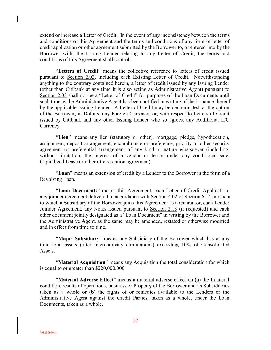 extend or increase a Letter of Credit. In the event of any inconsistency between the terms and conditions of this Agreement and the terms and conditions of any form of letter of credit application or other agreement submitted by the Borrower to, or entered into by the Borrower with, the Issuing Lender relating to any Letter of Credit, the terms and conditions of this Agreement shall control. “Letters of Credit” means the collective reference to letters of credit issued pursuant to Section 2.03, including each Existing Letter of Credit. Notwithstanding anything to the contrary contained herein, a letter of credit issued by any Issuing Lender (other than Citibank at any time it is also acting as Administrative Agent) pursuant to Section 2.03 shall not be a “Letter of Credit” for purposes of the Loan Documents until such time as the Administrative Agent has been notified in writing of the issuance thereof by the applicable Issuing Lender. A Letter of Credit may be denominated, at the option of the Borrower, in Dollars, any Foreign Currency, or, with respect to Letters of Credit issued by Citibank and any other Issuing Lender who so agrees, any Additional L/C Currency. “Lien” means any lien (statutory or other), mortgage, pledge, hypothecation, assignment, deposit arrangement, encumbrance or preference, priority or other security agreement or preferential arrangement of any kind or nature whatsoever (including, without limitation, the interest of a vendor or lessor under any conditional sale, Capitalized Lease or other title retention agreement). “Loan” means an extension of credit by a Lender to the Borrower in the form of a Revolving Loan. “Loan Documents” means this Agreement, each Letter of Credit Application, any joinder agreement delivered in accordance with Section 4.02 or Section 6.14 pursuant to which a Subsidiary of the Borrower joins this Agreement as a Guarantor, each Lender Joinder Agreement, any Notes issued pursuant to Section 2.13 (if requested) and each other document jointly designated as a “Loan Document” in writing by the Borrower and the Administrative Agent, as the same may be amended, restated or otherwise modified and in effect from time to time. “Major Subsidiary” means any Subsidiary of the Borrower which has at any time total assets (after intercompany eliminations) exceeding 10% of Consolidated Assets. “Material Acquisition” means any Acquisition the total consideration for which is equal to or greater than $220,000,000. “Material Adverse Effect” means a material adverse effect on (a) the financial condition, results of operations, business or Property of the Borrower and its Subsidiaries taken as a whole or (b) the rights of or remedies available to the Lenders or the Administrative Agent against the Credit Parties, taken as a whole, under the Loan Documents, taken as a whole. 27 #98230960v1
