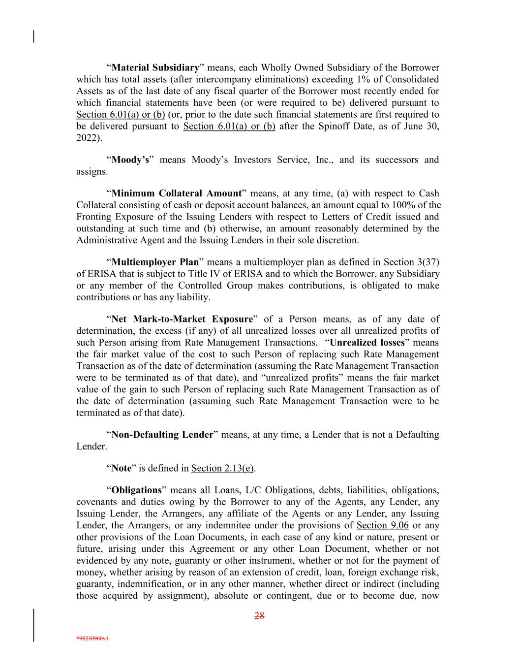 “Material Subsidiary” means, each Wholly Owned Subsidiary of the Borrower which has total assets (after intercompany eliminations) exceeding 1% of Consolidated Assets as of the last date of any fiscal quarter of the Borrower most recently ended for which financial statements have been (or were required to be) delivered pursuant to Section 6.01(a) or (b) (or, prior to the date such financial statements are first required to be delivered pursuant to Section 6.01(a) or (b) after the Spinoff Date, as of June 30, 2022). “Moody’s” means Moody’s Investors Service, Inc., and its successors and assigns. “Minimum Collateral Amount” means, at any time, (a) with respect to Cash Collateral consisting of cash or deposit account balances, an amount equal to 100% of the Fronting Exposure of the Issuing Lenders with respect to Letters of Credit issued and outstanding at such time and (b) otherwise, an amount reasonably determined by the Administrative Agent and the Issuing Lenders in their sole discretion. “Multiemployer Plan” means a multiemployer plan as defined in Section 3(37) of ERISA that is subject to Title IV of ERISA and to which the Borrower, any Subsidiary or any member of the Controlled Group makes contributions, is obligated to make contributions or has any liability. “Net Mark-to-Market Exposure” of a Person means, as of any date of determination, the excess (if any) of all unrealized losses over all unrealized profits of such Person arising from Rate Management Transactions. “Unrealized losses” means the fair market value of the cost to such Person of replacing such Rate Management Transaction as of the date of determination (assuming the Rate Management Transaction were to be terminated as of that date), and “unrealized profits” means the fair market value of the gain to such Person of replacing such Rate Management Transaction as of the date of determination (assuming such Rate Management Transaction were to be terminated as of that date). “Non-Defaulting Lender” means, at any time, a Lender that is not a Defaulting Lender. “Note” is defined in Section 2.13(e). “Obligations” means all Loans, L/C Obligations, debts, liabilities, obligations, covenants and duties owing by the Borrower to any of the Agents, any Lender, any Issuing Lender, the Arrangers, any affiliate of the Agents or any Lender, any Issuing Lender, the Arrangers, or any indemnitee under the provisions of Section 9.06 or any other provisions of the Loan Documents, in each case of any kind or nature, present or future, arising under this Agreement or any other Loan Document, whether or not evidenced by any note, guaranty or other instrument, whether or not for the payment of money, whether arising by reason of an extension of credit, loan, foreign exchange risk, guaranty, indemnification, or in any other manner, whether direct or indirect (including those acquired by assignment), absolute or contingent, due or to become due, now 28 #98230960v1