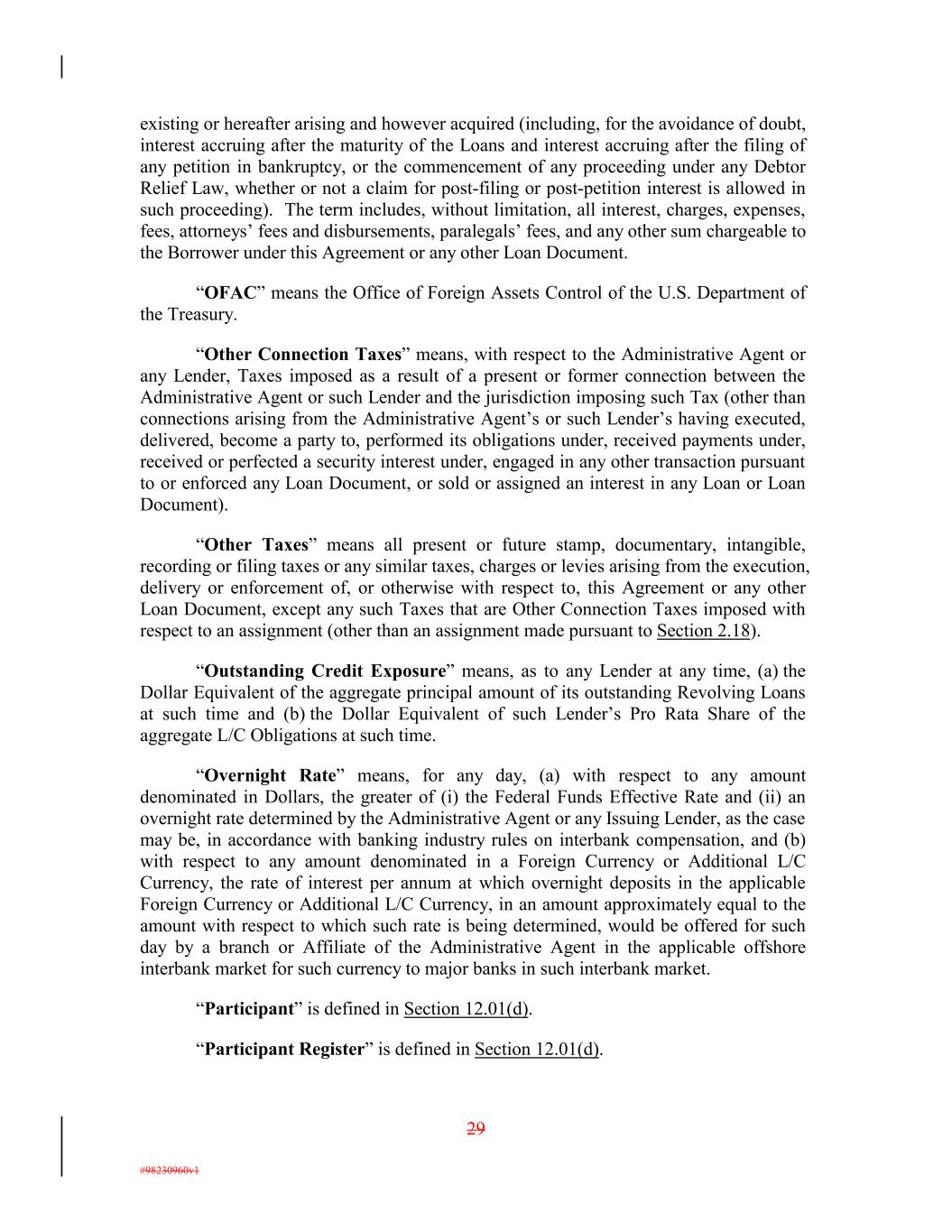 existing or hereafter arising and however acquired (including, for the avoidance of doubt, interest accruing after the maturity of the Loans and interest accruing after the filing of any petition in bankruptcy, or the commencement of any proceeding under any Debtor Relief Law, whether or not a claim for post-filing or post-petition interest is allowed in such proceeding). The term includes, without limitation, all interest, charges, expenses, fees, attorneys’ fees and disbursements, paralegals’ fees, and any other sum chargeable to the Borrower under this Agreement or any other Loan Document. “OFAC” means the Office of Foreign Assets Control of the U.S. Department of the Treasury. “Other Connection Taxes” means, with respect to the Administrative Agent or any Lender, Taxes imposed as a result of a present or former connection between the Administrative Agent or such Lender and the jurisdiction imposing such Tax (other than connections arising from the Administrative Agent’s or such Lender’s having executed, delivered, become a party to, performed its obligations under, received payments under, received or perfected a security interest under, engaged in any other transaction pursuant to or enforced any Loan Document, or sold or assigned an interest in any Loan or Loan Document). “Other Taxes” means all present or future stamp, documentary, intangible, recording or filing taxes or any similar taxes, charges or levies arising from the execution, delivery or enforcement of, or otherwise with respect to, this Agreement or any other Loan Document, except any such Taxes that are Other Connection Taxes imposed with respect to an assignment (other than an assignment made pursuant to Section 2.18). “Outstanding Credit Exposure” means, as to any Lender at any time, (a) the Dollar Equivalent of the aggregate principal amount of its outstanding Revolving Loans at such time and (b) the Dollar Equivalent of such Lender’s Pro Rata Share of the aggregate L/C Obligations at such time. “Overnight Rate” means, for any day, (a) with respect to any amount denominated in Dollars, the greater of (i) the Federal Funds Effective Rate and (ii) an overnight rate determined by the Administrative Agent or any Issuing Lender, as the case may be, in accordance with banking industry rules on interbank compensation, and (b) with respect to any amount denominated in a Foreign Currency or Additional L/C Currency, the rate of interest per annum at which overnight deposits in the applicable Foreign Currency or Additional L/C Currency, in an amount approximately equal to the amount with respect to which such rate is being determined, would be offered for such day by a branch or Affiliate of the Administrative Agent in the applicable offshore interbank market for such currency to major banks in such interbank market. “Participant” is defined in Section 12.01(d). “Participant Register” is defined in Section 12.01(d). 29 #98230960v1