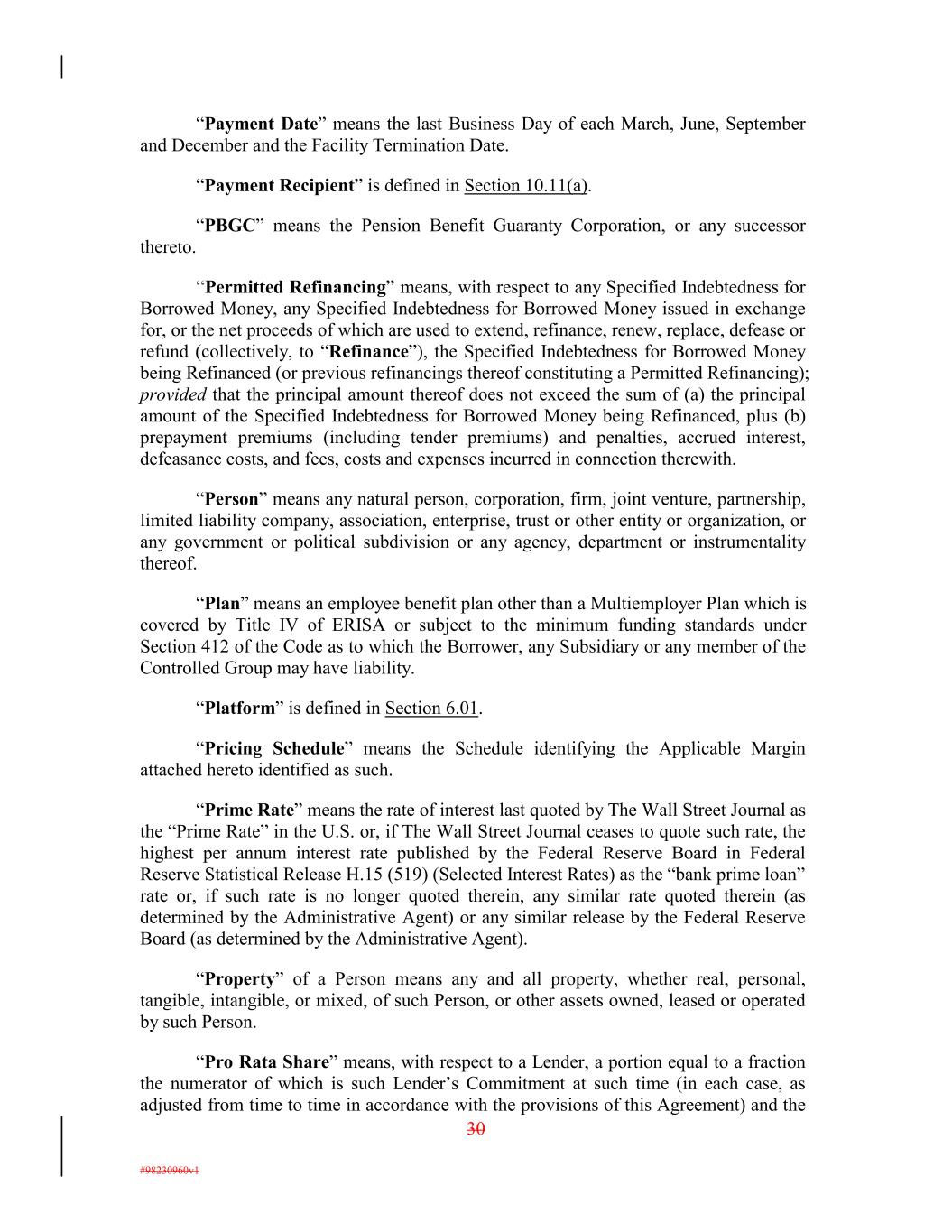 “Payment Date” means the last Business Day of each March, June, September and December and the Facility Termination Date. “Payment Recipient” is defined in Section 10.11(a). “PBGC” means the Pension Benefit Guaranty Corporation, or any successor thereto. “Permitted Refinancing” means, with respect to any Specified Indebtedness for Borrowed Money, any Specified Indebtedness for Borrowed Money issued in exchange for, or the net proceeds of which are used to extend, refinance, renew, replace, defease or refund (collectively, to “Refinance”), the Specified Indebtedness for Borrowed Money being Refinanced (or previous refinancings thereof constituting a Permitted Refinancing); provided that the principal amount thereof does not exceed the sum of (a) the principal amount of the Specified Indebtedness for Borrowed Money being Refinanced, plus (b) prepayment premiums (including tender premiums) and penalties, accrued interest, defeasance costs, and fees, costs and expenses incurred in connection therewith. “Person” means any natural person, corporation, firm, joint venture, partnership, limited liability company, association, enterprise, trust or other entity or organization, or any government or political subdivision or any agency, department or instrumentality thereof. “Plan” means an employee benefit plan other than a Multiemployer Plan which is covered by Title IV of ERISA or subject to the minimum funding standards under Section 412 of the Code as to which the Borrower, any Subsidiary or any member of the Controlled Group may have liability. “Platform” is defined in Section 6.01. “Pricing Schedule” means the Schedule identifying the Applicable Margin attached hereto identified as such. “Prime Rate” means the rate of interest last quoted by The Wall Street Journal as the “Prime Rate” in the U.S. or, if The Wall Street Journal ceases to quote such rate, the highest per annum interest rate published by the Federal Reserve Board in Federal Reserve Statistical Release H.15 (519) (Selected Interest Rates) as the “bank prime loan” rate or, if such rate is no longer quoted therein, any similar rate quoted therein (as determined by the Administrative Agent) or any similar release by the Federal Reserve Board (as determined by the Administrative Agent). “Property” of a Person means any and all property, whether real, personal, tangible, intangible, or mixed, of such Person, or other assets owned, leased or operated by such Person. “Pro Rata Share” means, with respect to a Lender, a portion equal to a fraction the numerator of which is such Lender’s Commitment at such time (in each case, as adjusted from time to time in accordance with the provisions of this Agreement) and the 30 #98230960v1