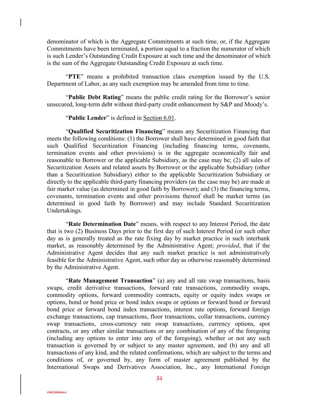 denominator of which is the Aggregate Commitments at such time, or, if the Aggregate Commitments have been terminated, a portion equal to a fraction the numerator of which is such Lender’s Outstanding Credit Exposure at such time and the denominator of which is the sum of the Aggregate Outstanding Credit Exposure at such time. “PTE” means a prohibited transaction class exemption issued by the U.S. Department of Labor, as any such exemption may be amended from time to time. “Public Debt Rating” means the public credit rating for the Borrower’s senior unsecured, long-term debt without third-party credit enhancement by S&P and Moody’s. “Public Lender” is defined in Section 6.01. “Qualified Securitization Financing” means any Securitization Financing that meets the following conditions: (1) the Borrower shall have determined in good faith that such Qualified Securitization Financing (including financing terms, covenants, termination events and other provisions) is in the aggregate economically fair and reasonable to Borrower or the applicable Subsidiary, as the case may be; (2) all sales of Securitization Assets and related assets by Borrower or the applicable Subsidiary (other than a Securitization Subsidiary) either to the applicable Securitization Subsidiary or directly to the applicable third-party financing providers (as the case may be) are made at fair market value (as determined in good faith by Borrower); and (3) the financing terms, covenants, termination events and other provisions thereof shall be market terms (as determined in good faith by Borrower) and may include Standard Securitization Undertakings. “Rate Determination Date” means, with respect to any Interest Period, the date that is two (2) Business Days prior to the first day of such Interest Period (or such other day as is generally treated as the rate fixing day by market practice in such interbank market, as reasonably determined by the Administrative Agent; provided, that if the Administrative Agent decides that any such market practice is not administratively feasible for the Administrative Agent, such other day as otherwise reasonably determined by the Administrative Agent. “Rate Management Transaction” (a) any and all rate swap transactions, basis swaps, credit derivative transactions, forward rate transactions, commodity swaps, commodity options, forward commodity contracts, equity or equity index swaps or options, bond or bond price or bond index swaps or options or forward bond or forward bond price or forward bond index transactions, interest rate options, forward foreign exchange transactions, cap transactions, floor transactions, collar transactions, currency swap transactions, cross-currency rate swap transactions, currency options, spot contracts, or any other similar transactions or any combination of any of the foregoing (including any options to enter into any of the foregoing), whether or not any such transaction is governed by or subject to any master agreement, and (b) any and all transactions of any kind, and the related confirmations, which are subject to the terms and conditions of, or governed by, any form of master agreement published by the International Swaps and Derivatives Association, Inc., any International Foreign 31 #98230960v1