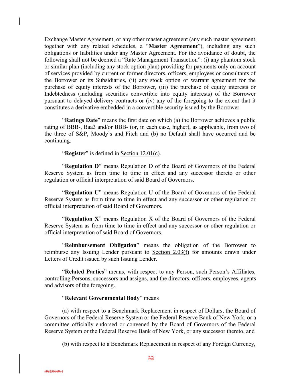 Exchange Master Agreement, or any other master agreement (any such master agreement, together with any related schedules, a “Master Agreement”), including any such obligations or liabilities under any Master Agreement. For the avoidance of doubt, the following shall not be deemed a “Rate Management Transaction”: (i) any phantom stock or similar plan (including any stock option plan) providing for payments only on account of services provided by current or former directors, officers, employees or consultants of the Borrower or its Subsidiaries, (ii) any stock option or warrant agreement for the purchase of equity interests of the Borrower, (iii) the purchase of equity interests or Indebtedness (including securities convertible into equity interests) of the Borrower pursuant to delayed delivery contracts or (iv) any of the foregoing to the extent that it constitutes a derivative embedded in a convertible security issued by the Borrower. “Ratings Date” means the first date on which (a) the Borrower achieves a public rating of BBB-, Baa3 and/or BBB- (or, in each case, higher), as applicable, from two of the three of S&P, Moody’s and Fitch and (b) no Default shall have occurred and be continuing. “Register” is defined in Section 12.01(c). “Regulation D” means Regulation D of the Board of Governors of the Federal Reserve System as from time to time in effect and any successor thereto or other regulation or official interpretation of said Board of Governors. “Regulation U” means Regulation U of the Board of Governors of the Federal Reserve System as from time to time in effect and any successor or other regulation or official interpretation of said Board of Governors. “Regulation X” means Regulation X of the Board of Governors of the Federal Reserve System as from time to time in effect and any successor or other regulation or official interpretation of said Board of Governors. “Reimbursement Obligation” means the obligation of the Borrower to reimburse any Issuing Lender pursuant to Section 2.03(f) for amounts drawn under Letters of Credit issued by such Issuing Lender. “Related Parties” means, with respect to any Person, such Person’s Affiliates, controlling Persons, successors and assigns, and the directors, officers, employees, agents and advisors of the foregoing. “Relevant Governmental Body” means (a) with respect to a Benchmark Replacement in respect of Dollars, the Board of Governors of the Federal Reserve System or the Federal Reserve Bank of New York, or a committee officially endorsed or convened by the Board of Governors of the Federal Reserve System or the Federal Reserve Bank of New York, or any successor thereto, and (b) with respect to a Benchmark Replacement in respect of any Foreign Currency, 32 #98230960v1