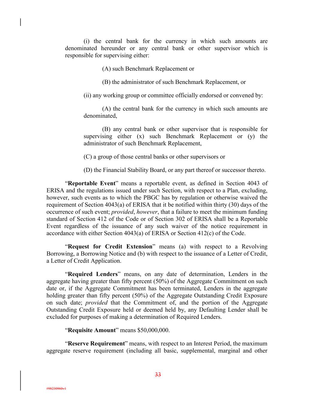 (i) the central bank for the currency in which such amounts are denominated hereunder or any central bank or other supervisor which is responsible for supervising either: (A) such Benchmark Replacement or (B) the administrator of such Benchmark Replacement, or (ii) any working group or committee officially endorsed or convened by: (A) the central bank for the currency in which such amounts are denominated, (B) any central bank or other supervisor that is responsible for supervising either (x) such Benchmark Replacement or (y) the administrator of such Benchmark Replacement, (C) a group of those central banks or other supervisors or (D) the Financial Stability Board, or any part thereof or successor thereto. “Reportable Event” means a reportable event, as defined in Section 4043 of ERISA and the regulations issued under such Section, with respect to a Plan, excluding, however, such events as to which the PBGC has by regulation or otherwise waived the requirement of Section 4043(a) of ERISA that it be notified within thirty (30) days of the occurrence of such event; provided, however, that a failure to meet the minimum funding standard of Section 412 of the Code or of Section 302 of ERISA shall be a Reportable Event regardless of the issuance of any such waiver of the notice requirement in accordance with either Section 4043(a) of ERISA or Section 412(c) of the Code. “Request for Credit Extension” means (a) with respect to a Revolving Borrowing, a Borrowing Notice and (b) with respect to the issuance of a Letter of Credit, a Letter of Credit Application. “Required Lenders” means, on any date of determination, Lenders in the aggregate having greater than fifty percent (50%) of the Aggregate Commitment on such date or, if the Aggregate Commitment has been terminated, Lenders in the aggregate holding greater than fifty percent (50%) of the Aggregate Outstanding Credit Exposure on such date; provided that the Commitment of, and the portion of the Aggregate Outstanding Credit Exposure held or deemed held by, any Defaulting Lender shall be excluded for purposes of making a determination of Required Lenders. “Requisite Amount” means $50,000,000. “Reserve Requirement” means, with respect to an Interest Period, the maximum aggregate reserve requirement (including all basic, supplemental, marginal and other 33 #98230960v1