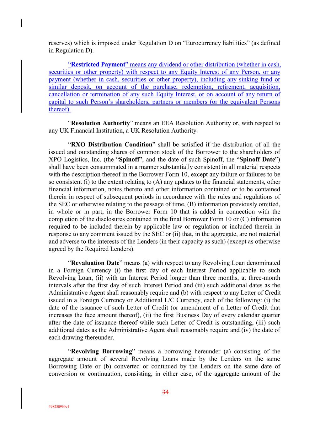 reserves) which is imposed under Regulation D on “Eurocurrency liabilities” (as defined in Regulation D). “Restricted Payment” means any dividend or other distribution (whether in cash, securities or other property) with respect to any Equity Interest of any Person, or any payment (whether in cash, securities or other property), including any sinking fund or similar deposit, on account of the purchase, redemption, retirement, acquisition, cancellation or termination of any such Equity Interest, or on account of any return of capital to such Person’s shareholders, partners or members (or the equivalent Persons thereof). “Resolution Authority” means an EEA Resolution Authority or, with respect to any UK Financial Institution, a UK Resolution Authority. “RXO Distribution Condition” shall be satisfied if the distribution of all the issued and outstanding shares of common stock of the Borrower to the shareholders of XPO Logistics, Inc. (the “Spinoff”, and the date of such Spinoff, the “Spinoff Date”) shall have been consummated in a manner substantially consistent in all material respects with the description thereof in the Borrower Form 10, except any failure or failures to be so consistent (i) to the extent relating to (A) any updates to the financial statements, other financial information, notes thereto and other information contained or to be contained therein in respect of subsequent periods in accordance with the rules and regulations of the SEC or otherwise relating to the passage of time, (B) information previously omitted, in whole or in part, in the Borrower Form 10 that is added in connection with the completion of the disclosures contained in the final Borrower Form 10 or (C) information required to be included therein by applicable law or regulation or included therein in response to any comment issued by the SEC or (ii) that, in the aggregate, are not material and adverse to the interests of the Lenders (in their capacity as such) (except as otherwise agreed by the Required Lenders). “Revaluation Date” means (a) with respect to any Revolving Loan denominated in a Foreign Currency (i) the first day of each Interest Period applicable to such Revolving Loan, (ii) with an Interest Period longer than three months, at three-month intervals after the first day of such Interest Period and (iii) such additional dates as the Administrative Agent shall reasonably require and (b) with respect to any Letter of Credit issued in a Foreign Currency or Additional L/C Currency, each of the following: (i) the date of the issuance of such Letter of Credit (or amendment of a Letter of Credit that increases the face amount thereof), (ii) the first Business Day of every calendar quarter after the date of issuance thereof while such Letter of Credit is outstanding, (iii) such additional dates as the Administrative Agent shall reasonably require and (iv) the date of each drawing thereunder. “Revolving Borrowing” means a borrowing hereunder (a) consisting of the aggregate amount of several Revolving Loans made by the Lenders on the same Borrowing Date or (b) converted or continued by the Lenders on the same date of conversion or continuation, consisting, in either case, of the aggregate amount of the 34 #98230960v1