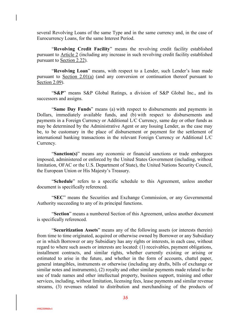several Revolving Loans of the same Type and in the same currency and, in the case of Eurocurrency Loans, for the same Interest Period. “Revolving Credit Facility” means the revolving credit facility established pursuant to Article 2 (including any increase in such revolving credit facility established pursuant to Section 2.22). “Revolving Loan” means, with respect to a Lender, such Lender’s loan made pursuant to Section 2.01(a) (and any conversion or continuation thereof pursuant to Section 2.09). “S&P” means S&P Global Ratings, a division of S&P Global Inc., and its successors and assigns. “Same Day Funds” means (a) with respect to disbursements and payments in Dollars, immediately available funds, and (b) with respect to disbursements and payments in a Foreign Currency or Additional L/C Currency, same day or other funds as may be determined by the Administrative Agent or any Issuing Lender, as the case may be, to be customary in the place of disbursement or payment for the settlement of international banking transactions in the relevant Foreign Currency or Additional L/C Currency. “Sanction(s)” means any economic or financial sanctions or trade embargoes imposed, administered or enforced by the United States Government (including, without limitation, OFAC or the U.S. Department of State), the United Nations Security Council, the European Union or His Majesty’s Treasury. “Schedule” refers to a specific schedule to this Agreement, unless another document is specifically referenced. “SEC” means the Securities and Exchange Commission, or any Governmental Authority succeeding to any of its principal functions. “Section” means a numbered Section of this Agreement, unless another document is specifically referenced. “Securitization Assets” means any of the following assets (or interests therein) from time to time originated, acquired or otherwise owned by Borrower or any Subsidiary or in which Borrower or any Subsidiary has any rights or interests, in each case, without regard to where such assets or interests are located: (1) receivables, payment obligations, installment contracts, and similar rights, whether currently existing or arising or estimated to arise in the future, and whether in the form of accounts, chattel paper, general intangibles, instruments or otherwise (including any drafts, bills of exchange or similar notes and instruments), (2) royalty and other similar payments made related to the use of trade names and other intellectual property, business support, training and other services, including, without limitation, licensing fees, lease payments and similar revenue streams, (3) revenues related to distribution and merchandising of the products of 35 #98230960v1