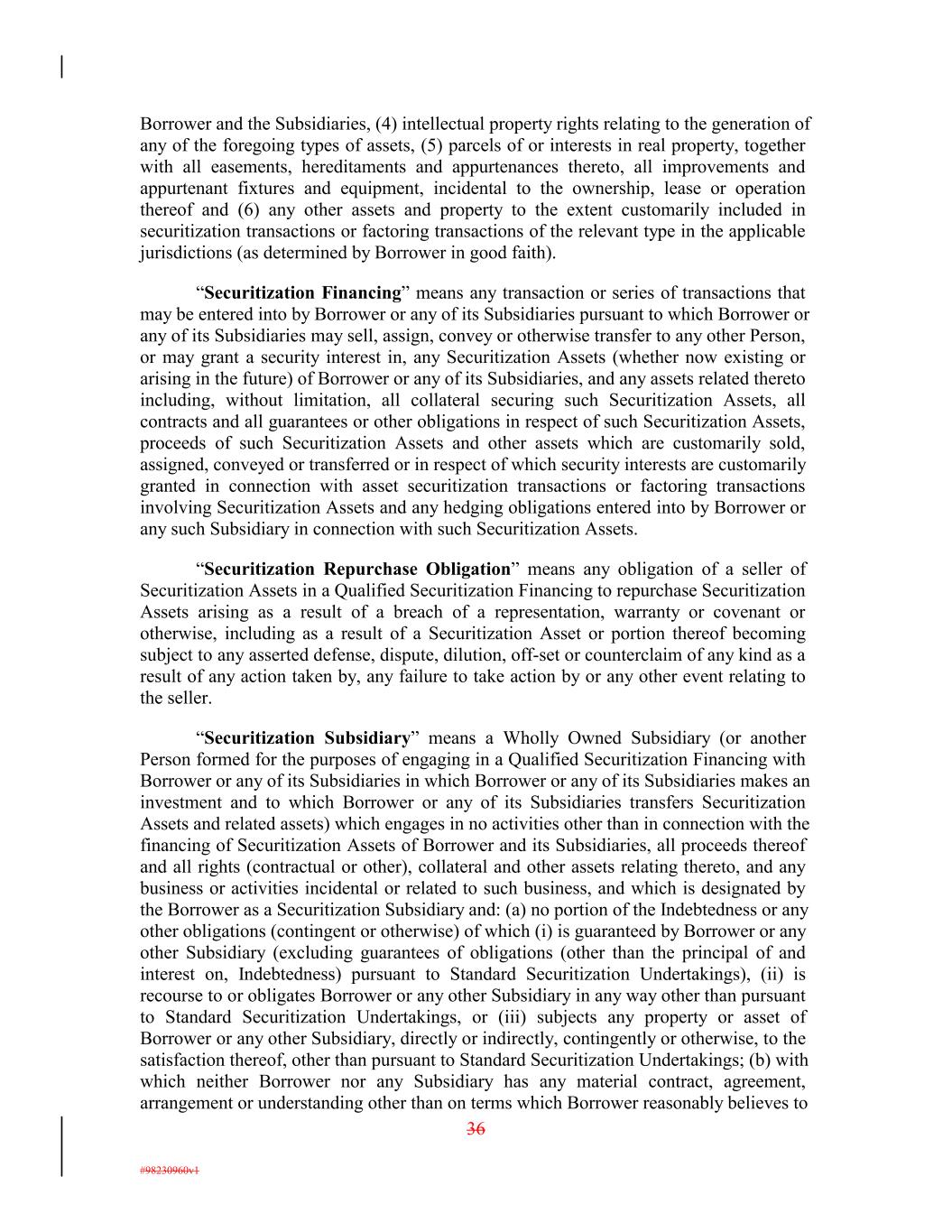 Borrower and the Subsidiaries, (4) intellectual property rights relating to the generation of any of the foregoing types of assets, (5) parcels of or interests in real property, together with all easements, hereditaments and appurtenances thereto, all improvements and appurtenant fixtures and equipment, incidental to the ownership, lease or operation thereof and (6) any other assets and property to the extent customarily included in securitization transactions or factoring transactions of the relevant type in the applicable jurisdictions (as determined by Borrower in good faith). “Securitization Financing” means any transaction or series of transactions that may be entered into by Borrower or any of its Subsidiaries pursuant to which Borrower or any of its Subsidiaries may sell, assign, convey or otherwise transfer to any other Person, or may grant a security interest in, any Securitization Assets (whether now existing or arising in the future) of Borrower or any of its Subsidiaries, and any assets related thereto including, without limitation, all collateral securing such Securitization Assets, all contracts and all guarantees or other obligations in respect of such Securitization Assets, proceeds of such Securitization Assets and other assets which are customarily sold, assigned, conveyed or transferred or in respect of which security interests are customarily granted in connection with asset securitization transactions or factoring transactions involving Securitization Assets and any hedging obligations entered into by Borrower or any such Subsidiary in connection with such Securitization Assets. “Securitization Repurchase Obligation” means any obligation of a seller of Securitization Assets in a Qualified Securitization Financing to repurchase Securitization Assets arising as a result of a breach of a representation, warranty or covenant or otherwise, including as a result of a Securitization Asset or portion thereof becoming subject to any asserted defense, dispute, dilution, off-set or counterclaim of any kind as a result of any action taken by, any failure to take action by or any other event relating to the seller. “Securitization Subsidiary” means a Wholly Owned Subsidiary (or another Person formed for the purposes of engaging in a Qualified Securitization Financing with Borrower or any of its Subsidiaries in which Borrower or any of its Subsidiaries makes an investment and to which Borrower or any of its Subsidiaries transfers Securitization Assets and related assets) which engages in no activities other than in connection with the financing of Securitization Assets of Borrower and its Subsidiaries, all proceeds thereof and all rights (contractual or other), collateral and other assets relating thereto, and any business or activities incidental or related to such business, and which is designated by the Borrower as a Securitization Subsidiary and: (a) no portion of the Indebtedness or any other obligations (contingent or otherwise) of which (i) is guaranteed by Borrower or any other Subsidiary (excluding guarantees of obligations (other than the principal of and interest on, Indebtedness) pursuant to Standard Securitization Undertakings), (ii) is recourse to or obligates Borrower or any other Subsidiary in any way other than pursuant to Standard Securitization Undertakings, or (iii) subjects any property or asset of Borrower or any other Subsidiary, directly or indirectly, contingently or otherwise, to the satisfaction thereof, other than pursuant to Standard Securitization Undertakings; (b) with which neither Borrower nor any Subsidiary has any material contract, agreement, arrangement or understanding other than on terms which Borrower reasonably believes to 36 #98230960v1
