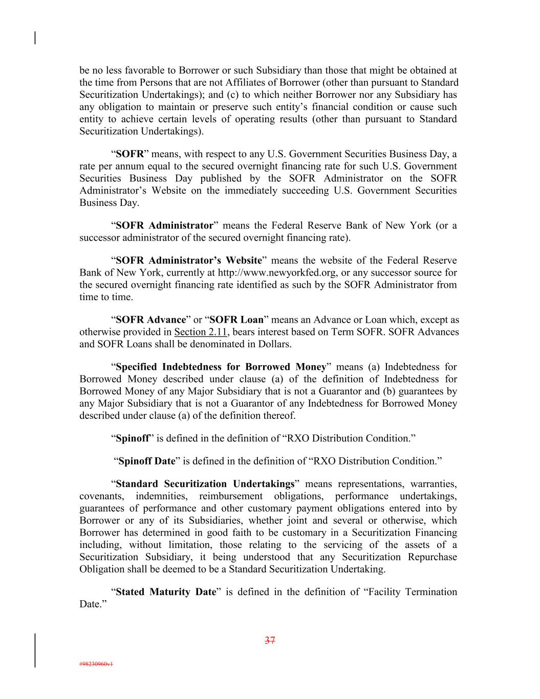 be no less favorable to Borrower or such Subsidiary than those that might be obtained at the time from Persons that are not Affiliates of Borrower (other than pursuant to Standard Securitization Undertakings); and (c) to which neither Borrower nor any Subsidiary has any obligation to maintain or preserve such entity’s financial condition or cause such entity to achieve certain levels of operating results (other than pursuant to Standard Securitization Undertakings). “SOFR” means, with respect to any U.S. Government Securities Business Day, a rate per annum equal to the secured overnight financing rate for such U.S. Government Securities Business Day published by the SOFR Administrator on the SOFR Administrator’s Website on the immediately succeeding U.S. Government Securities Business Day. “SOFR Administrator” means the Federal Reserve Bank of New York (or a successor administrator of the secured overnight financing rate). “SOFR Administrator’s Website” means the website of the Federal Reserve Bank of New York, currently at http://www.newyorkfed.org, or any successor source for the secured overnight financing rate identified as such by the SOFR Administrator from time to time. “SOFR Advance” or “SOFR Loan” means an Advance or Loan which, except as otherwise provided in Section 2.11, bears interest based on Term SOFR. SOFR Advances and SOFR Loans shall be denominated in Dollars. “Specified Indebtedness for Borrowed Money” means (a) Indebtedness for Borrowed Money described under clause (a) of the definition of Indebtedness for Borrowed Money of any Major Subsidiary that is not a Guarantor and (b) guarantees by any Major Subsidiary that is not a Guarantor of any Indebtedness for Borrowed Money described under clause (a) of the definition thereof. “Spinoff” is defined in the definition of “RXO Distribution Condition.” “Spinoff Date” is defined in the definition of “RXO Distribution Condition.” “Standard Securitization Undertakings” means representations, warranties, covenants, indemnities, reimbursement obligations, performance undertakings, guarantees of performance and other customary payment obligations entered into by Borrower or any of its Subsidiaries, whether joint and several or otherwise, which Borrower has determined in good faith to be customary in a Securitization Financing including, without limitation, those relating to the servicing of the assets of a Securitization Subsidiary, it being understood that any Securitization Repurchase Obligation shall be deemed to be a Standard Securitization Undertaking. “Stated Maturity Date” is defined in the definition of “Facility Termination Date.” 37 #98230960v1