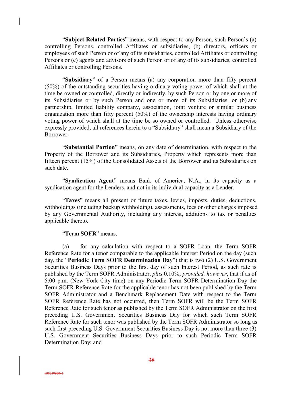 “Subject Related Parties” means, with respect to any Person, such Person’s (a) controlling Persons, controlled Affiliates or subsidiaries, (b) directors, officers or employees of such Person or of any of its subsidiaries, controlled Affiliates or controlling Persons or (c) agents and advisors of such Person or of any of its subsidiaries, controlled Affiliates or controlling Persons. “Subsidiary” of a Person means (a) any corporation more than fifty percent (50%) of the outstanding securities having ordinary voting power of which shall at the time be owned or controlled, directly or indirectly, by such Person or by one or more of its Subsidiaries or by such Person and one or more of its Subsidiaries, or (b) any partnership, limited liability company, association, joint venture or similar business organization more than fifty percent (50%) of the ownership interests having ordinary voting power of which shall at the time be so owned or controlled. Unless otherwise expressly provided, all references herein to a “Subsidiary” shall mean a Subsidiary of the Borrower. “Substantial Portion” means, on any date of determination, with respect to the Property of the Borrower and its Subsidiaries, Property which represents more than fifteen percent (15%) of the Consolidated Assets of the Borrower and its Subsidiaries on such date. “Syndication Agent” means Bank of America, N.A., in its capacity as a syndication agent for the Lenders, and not in its individual capacity as a Lender. “Taxes” means all present or future taxes, levies, imposts, duties, deductions, withholdings (including backup withholding), assessments, fees or other charges imposed by any Governmental Authority, including any interest, additions to tax or penalties applicable thereto. “Term SOFR” means, (a) for any calculation with respect to a SOFR Loan, the Term SOFR Reference Rate for a tenor comparable to the applicable Interest Period on the day (such day, the “Periodic Term SOFR Determination Day”) that is two (2) U.S. Government Securities Business Days prior to the first day of such Interest Period, as such rate is published by the Term SOFR Administrator, plus 0.10%; provided, however, that if as of 5:00 p.m. (New York City time) on any Periodic Term SOFR Determination Day the Term SOFR Reference Rate for the applicable tenor has not been published by the Term SOFR Administrator and a Benchmark Replacement Date with respect to the Term SOFR Reference Rate has not occurred, then Term SOFR will be the Term SOFR Reference Rate for such tenor as published by the Term SOFR Administrator on the first preceding U.S. Government Securities Business Day for which such Term SOFR Reference Rate for such tenor was published by the Term SOFR Administrator so long as such first preceding U.S. Government Securities Business Day is not more than three (3) U.S. Government Securities Business Days prior to such Periodic Term SOFR Determination Day; and 38 #98230960v1