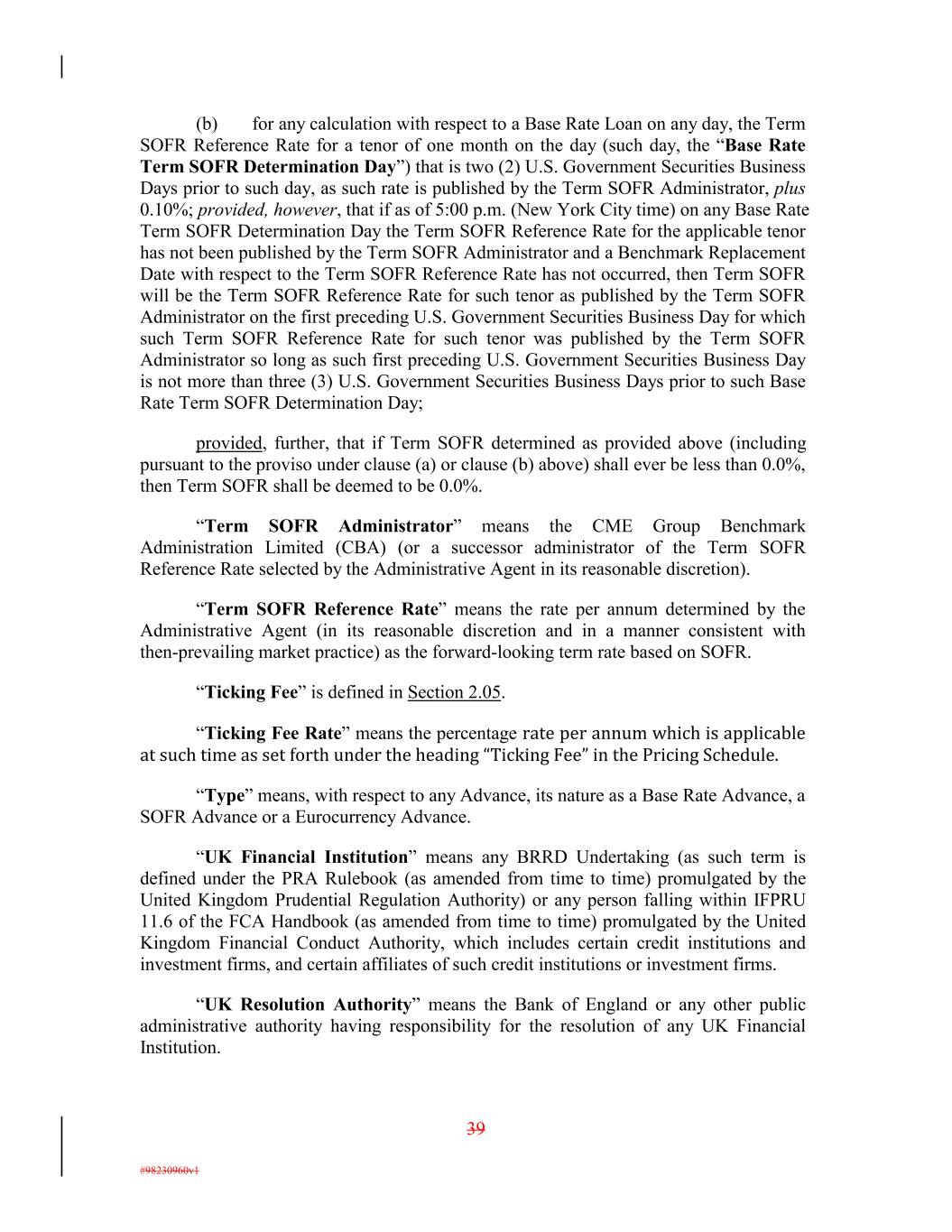 (b) for any calculation with respect to a Base Rate Loan on any day, the Term SOFR Reference Rate for a tenor of one month on the day (such day, the “Base Rate Term SOFR Determination Day”) that is two (2) U.S. Government Securities Business Days prior to such day, as such rate is published by the Term SOFR Administrator, plus 0.10%; provided, however, that if as of 5:00 p.m. (New York City time) on any Base Rate Term SOFR Determination Day the Term SOFR Reference Rate for the applicable tenor has not been published by the Term SOFR Administrator and a Benchmark Replacement Date with respect to the Term SOFR Reference Rate has not occurred, then Term SOFR will be the Term SOFR Reference Rate for such tenor as published by the Term SOFR Administrator on the first preceding U.S. Government Securities Business Day for which such Term SOFR Reference Rate for such tenor was published by the Term SOFR Administrator so long as such first preceding U.S. Government Securities Business Day is not more than three (3) U.S. Government Securities Business Days prior to such Base Rate Term SOFR Determination Day; provided, further, that if Term SOFR determined as provided above (including pursuant to the proviso under clause (a) or clause (b) above) shall ever be less than 0.0%, then Term SOFR shall be deemed to be 0.0%. “Term SOFR Administrator” means the CME Group Benchmark Administration Limited (CBA) (or a successor administrator of the Term SOFR Reference Rate selected by the Administrative Agent in its reasonable discretion). “Term SOFR Reference Rate” means the rate per annum determined by the Administrative Agent (in its reasonable discretion and in a manner consistent with then-prevailing market practice) as the forward-looking term rate based on SOFR. “Ticking Fee” is defined in Section 2.05. “Ticking Fee Rate” means the percentage rate per annum which is applicable at such time as set forth under the heading “Ticking Fee” in the Pricing Schedule. “Type” means, with respect to any Advance, its nature as a Base Rate Advance, a SOFR Advance or a Eurocurrency Advance. “UK Financial Institution” means any BRRD Undertaking (as such term is defined under the PRA Rulebook (as amended from time to time) promulgated by the United Kingdom Prudential Regulation Authority) or any person falling within IFPRU 11.6 of the FCA Handbook (as amended from time to time) promulgated by the United Kingdom Financial Conduct Authority, which includes certain credit institutions and investment firms, and certain affiliates of such credit institutions or investment firms. “UK Resolution Authority” means the Bank of England or any other public administrative authority having responsibility for the resolution of any UK Financial Institution. 39 #98230960v1