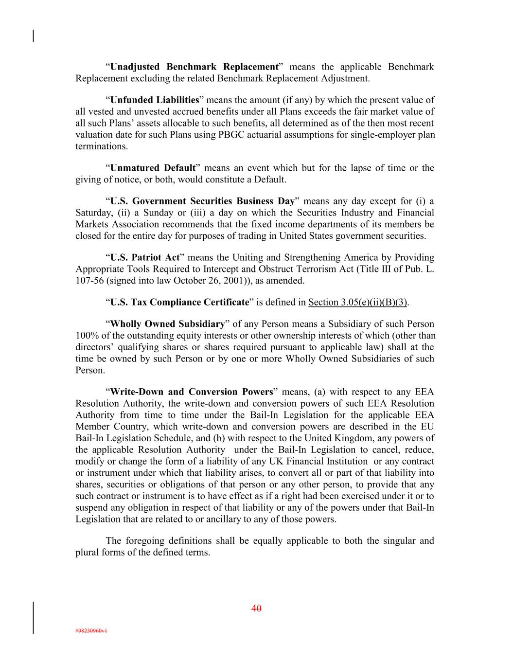 “Unadjusted Benchmark Replacement” means the applicable Benchmark Replacement excluding the related Benchmark Replacement Adjustment. “Unfunded Liabilities” means the amount (if any) by which the present value of all vested and unvested accrued benefits under all Plans exceeds the fair market value of all such Plans’ assets allocable to such benefits, all determined as of the then most recent valuation date for such Plans using PBGC actuarial assumptions for single-employer plan terminations. “Unmatured Default” means an event which but for the lapse of time or the giving of notice, or both, would constitute a Default. “U.S. Government Securities Business Day” means any day except for (i) a Saturday, (ii) a Sunday or (iii) a day on which the Securities Industry and Financial Markets Association recommends that the fixed income departments of its members be closed for the entire day for purposes of trading in United States government securities. “U.S. Patriot Act” means the Uniting and Strengthening America by Providing Appropriate Tools Required to Intercept and Obstruct Terrorism Act (Title III of Pub. L. 107-56 (signed into law October 26, 2001)), as amended. “U.S. Tax Compliance Certificate” is defined in Section 3.05(e)(ii)(B)(3). “Wholly Owned Subsidiary” of any Person means a Subsidiary of such Person 100% of the outstanding equity interests or other ownership interests of which (other than directors’ qualifying shares or shares required pursuant to applicable law) shall at the time be owned by such Person or by one or more Wholly Owned Subsidiaries of such Person. “Write-Down and Conversion Powers” means, (a) with respect to any EEA Resolution Authority, the write-down and conversion powers of such EEA Resolution Authority from time to time under the Bail-In Legislation for the applicable EEA Member Country, which write-down and conversion powers are described in the EU Bail-In Legislation Schedule, and (b) with respect to the United Kingdom, any powers of the applicable Resolution Authority under the Bail-In Legislation to cancel, reduce, modify or change the form of a liability of any UK Financial Institution or any contract or instrument under which that liability arises, to convert all or part of that liability into shares, securities or obligations of that person or any other person, to provide that any such contract or instrument is to have effect as if a right had been exercised under it or to suspend any obligation in respect of that liability or any of the powers under that Bail-In Legislation that are related to or ancillary to any of those powers. The foregoing definitions shall be equally applicable to both the singular and plural forms of the defined terms. 40 #98230960v1