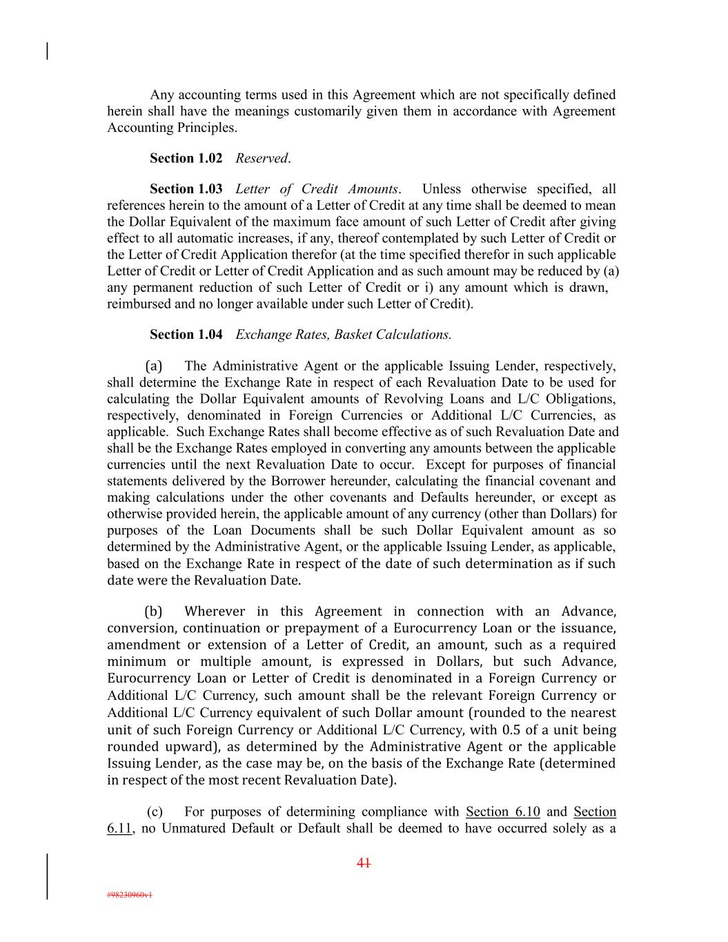 Any accounting terms used in this Agreement which are not specifically defined herein shall have the meanings customarily given them in accordance with Agreement Accounting Principles. Section 1.02 Reserved. Section 1.03 Letter of Credit Amounts. Unless otherwise specified, all references herein to the amount of a Letter of Credit at any time shall be deemed to mean the Dollar Equivalent of the maximum face amount of such Letter of Credit after giving effect to all automatic increases, if any, thereof contemplated by such Letter of Credit or the Letter of Credit Application therefor (at the time specified therefor in such applicable Letter of Credit or Letter of Credit Application and as such amount may be reduced by (a) any permanent reduction of such Letter of Credit or i) any amount which is drawn, reimbursed and no longer available under such Letter of Credit). Section 1.04 Exchange Rates, Basket Calculations. (a) The Administrative Agent or the applicable Issuing Lender, respectively, shall determine the Exchange Rate in respect of each Revaluation Date to be used for calculating the Dollar Equivalent amounts of Revolving Loans and L/C Obligations, respectively, denominated in Foreign Currencies or Additional L/C Currencies, as applicable. Such Exchange Rates shall become effective as of such Revaluation Date and shall be the Exchange Rates employed in converting any amounts between the applicable currencies until the next Revaluation Date to occur. Except for purposes of financial statements delivered by the Borrower hereunder, calculating the financial covenant and making calculations under the other covenants and Defaults hereunder, or except as otherwise provided herein, the applicable amount of any currency (other than Dollars) for purposes of the Loan Documents shall be such Dollar Equivalent amount as so determined by the Administrative Agent, or the applicable Issuing Lender, as applicable, based on the Exchange Rate in respect of the date of such determination as if such date were the Revaluation Date. (b) Wherever in this Agreement in connection with an Advance, conversion, continuation or prepayment of a Eurocurrency Loan or the issuance, amendment or extension of a Letter of Credit, an amount, such as a required minimum or multiple amount, is expressed in Dollars, but such Advance, Eurocurrency Loan or Letter of Credit is denominated in a Foreign Currency or Additional L/C Currency, such amount shall be the relevant Foreign Currency or Additional L/C Currency equivalent of such Dollar amount (rounded to the nearest unit of such Foreign Currency or Additional L/C Currency, with 0.5 of a unit being rounded upward), as determined by the Administrative Agent or the applicable Issuing Lender, as the case may be, on the basis of the Exchange Rate (determined in respect of the most recent Revaluation Date). (c) For purposes of determining compliance with Section 6.10 and Section 6.11, no Unmatured Default or Default shall be deemed to have occurred solely as a 41 #98230960v1