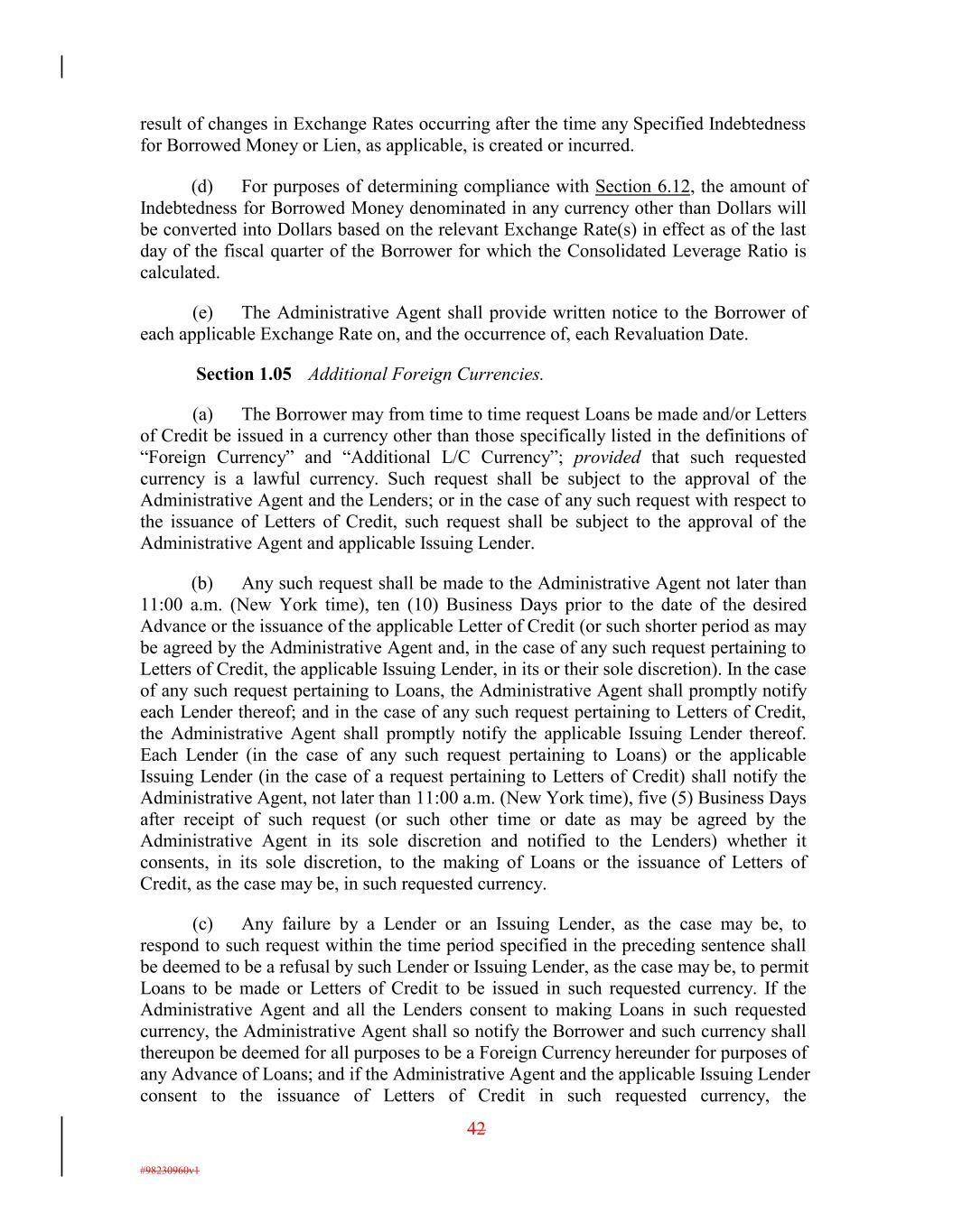 result of changes in Exchange Rates occurring after the time any Specified Indebtedness for Borrowed Money or Lien, as applicable, is created or incurred. (d) For purposes of determining compliance with Section 6.12, the amount of Indebtedness for Borrowed Money denominated in any currency other than Dollars will be converted into Dollars based on the relevant Exchange Rate(s) in effect as of the last day of the fiscal quarter of the Borrower for which the Consolidated Leverage Ratio is calculated. (e) The Administrative Agent shall provide written notice to the Borrower of each applicable Exchange Rate on, and the occurrence of, each Revaluation Date. Section 1.05 Additional Foreign Currencies. (a) The Borrower may from time to time request Loans be made and/or Letters of Credit be issued in a currency other than those specifically listed in the definitions of “Foreign Currency” and “Additional L/C Currency”; provided that such requested currency is a lawful currency. Such request shall be subject to the approval of the Administrative Agent and the Lenders; or in the case of any such request with respect to the issuance of Letters of Credit, such request shall be subject to the approval of the Administrative Agent and applicable Issuing Lender. (b) Any such request shall be made to the Administrative Agent not later than 11:00 a.m. (New York time), ten (10) Business Days prior to the date of the desired Advance or the issuance of the applicable Letter of Credit (or such shorter period as may be agreed by the Administrative Agent and, in the case of any such request pertaining to Letters of Credit, the applicable Issuing Lender, in its or their sole discretion). In the case of any such request pertaining to Loans, the Administrative Agent shall promptly notify each Lender thereof; and in the case of any such request pertaining to Letters of Credit, the Administrative Agent shall promptly notify the applicable Issuing Lender thereof. Each Lender (in the case of any such request pertaining to Loans) or the applicable Issuing Lender (in the case of a request pertaining to Letters of Credit) shall notify the Administrative Agent, not later than 11:00 a.m. (New York time), five (5) Business Days after receipt of such request (or such other time or date as may be agreed by the Administrative Agent in its sole discretion and notified to the Lenders) whether it consents, in its sole discretion, to the making of Loans or the issuance of Letters of Credit, as the case may be, in such requested currency. (c) Any failure by a Lender or an Issuing Lender, as the case may be, to respond to such request within the time period specified in the preceding sentence shall be deemed to be a refusal by such Lender or Issuing Lender, as the case may be, to permit Loans to be made or Letters of Credit to be issued in such requested currency. If the Administrative Agent and all the Lenders consent to making Loans in such requested currency, the Administrative Agent shall so notify the Borrower and such currency shall thereupon be deemed for all purposes to be a Foreign Currency hereunder for purposes of any Advance of Loans; and if the Administrative Agent and the applicable Issuing Lender consent to the issuance of Letters of Credit in such requested currency, the 42 #98230960v1