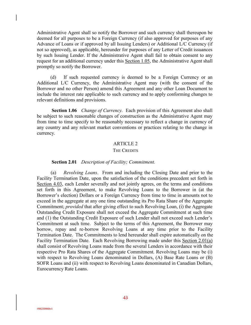 Administrative Agent shall so notify the Borrower and such currency shall thereupon be deemed for all purposes to be a Foreign Currency (if also approved for purposes of any Advance of Loans or if approved by all Issuing Lenders) or Additional L/C Currency (if not so approved), as applicable, hereunder for purposes of any Letter of Credit issuances by such Issuing Lender. If the Administrative Agent shall fail to obtain consent to any request for an additional currency under this Section 1.05, the Administrative Agent shall promptly so notify the Borrower. (d) If such requested currency is deemed to be a Foreign Currency or an Additional L/C Currency, the Administrative Agent may (with the consent of the Borrower and no other Person) amend this Agreement and any other Loan Document to include the interest rate applicable to such currency and to apply conforming changes to relevant definitions and provisions. Section 1.06 Change of Currency. Each provision of this Agreement also shall be subject to such reasonable changes of construction as the Administrative Agent may from time to time specify to be reasonably necessary to reflect a change in currency of any country and any relevant market conventions or practices relating to the change in currency. ARTICLE 2 THE CREDITS Section 2.01 Description of Facility; Commitment. (a) Revolving Loans. From and including the Closing Date and prior to the Facility Termination Date, upon the satisfaction of the conditions precedent set forth in Section 4.03, each Lender severally and not jointly agrees, on the terms and conditions set forth in this Agreement, to make Revolving Loans to the Borrower in (at the Borrower’s election) Dollars or a Foreign Currency from time to time in amounts not to exceed in the aggregate at any one time outstanding its Pro Rata Share of the Aggregate Commitment; provided that after giving effect to such Revolving Loan, (i) the Aggregate Outstanding Credit Exposure shall not exceed the Aggregate Commitment at such time and (1) the Outstanding Credit Exposure of such Lender shall not exceed such Lender’s Commitment at such time. Subject to the terms of this Agreement, the Borrower may borrow, repay and re-borrow Revolving Loans at any time prior to the Facility Termination Date. The Commitments to lend hereunder shall expire automatically on the Facility Termination Date. Each Revolving Borrowing made under this Section 2.01(a) shall consist of Revolving Loans made from the several Lenders in accordance with their respective Pro Rata Shares of the Aggregate Commitment. Revolving Loans may be (i) with respect to Revolving Loans denominated in Dollars, (A) Base Rate Loans or (B) SOFR Loans and (ii) with respect to Revolving Loans denominated in Canadian Dollars, Eurocurrency Rate Loans. 43 #98230960v1